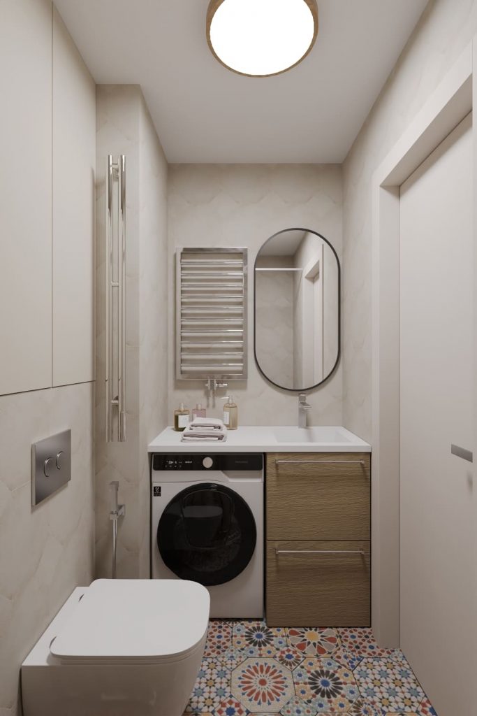 Стиральная машина встроена под столешницу, что делает зону умывания удобной и эргономичной. Зеркало с тонкой рамой визуально расширяет пространство, а подогреваемый полотенцесушитель добавляет функциональности. Навесные шкафы над унитазом позволяют хранить бытовую химию и другие необходимые принадлежности без перегруженности пространства.