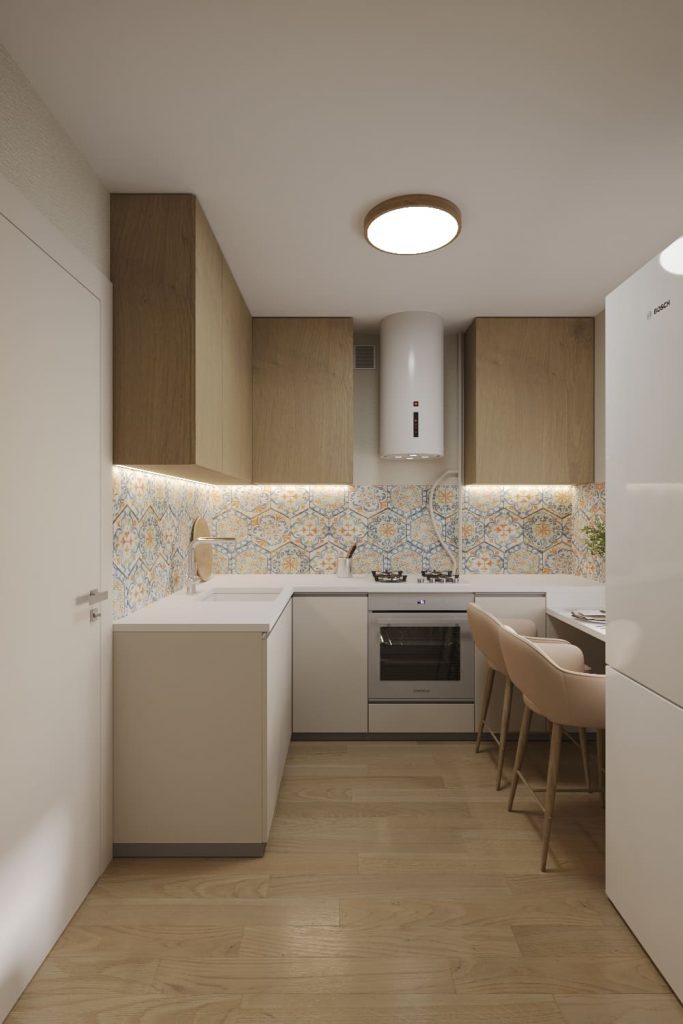 Главное украшение кухни — фартук из плитки с традиционными узорами, вдохновленный интерьерами южных стран. Оттенки терракоты, голубого и песочного создают ощущение уюта, перекликаясь с теплотой деревянных верхних шкафов.