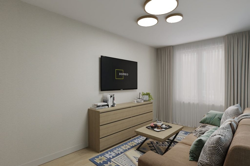 Главным элементом гостиной стал большой удобный диван в теплых песочных тонах. Он задает уютное настроение, а разнообразие подушек и пледов добавляет текстурности и уюта. Напротив расположен комод с телевизором, который не только выполняет роль медиа-зоны, но и служит дополнительной системой хранения.