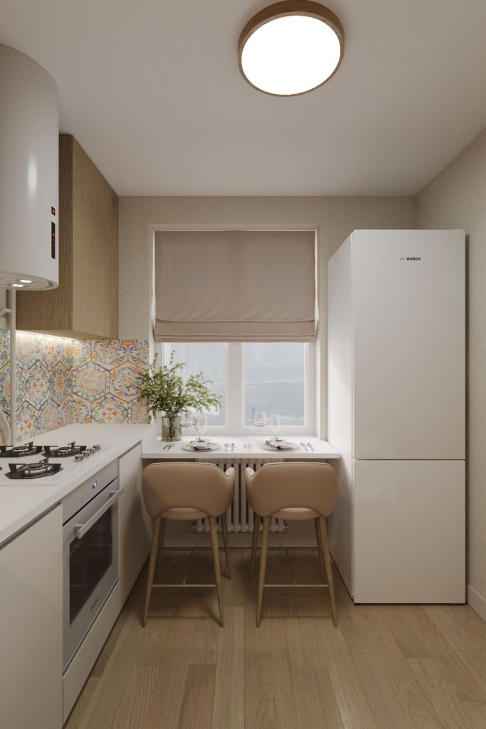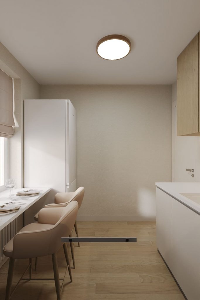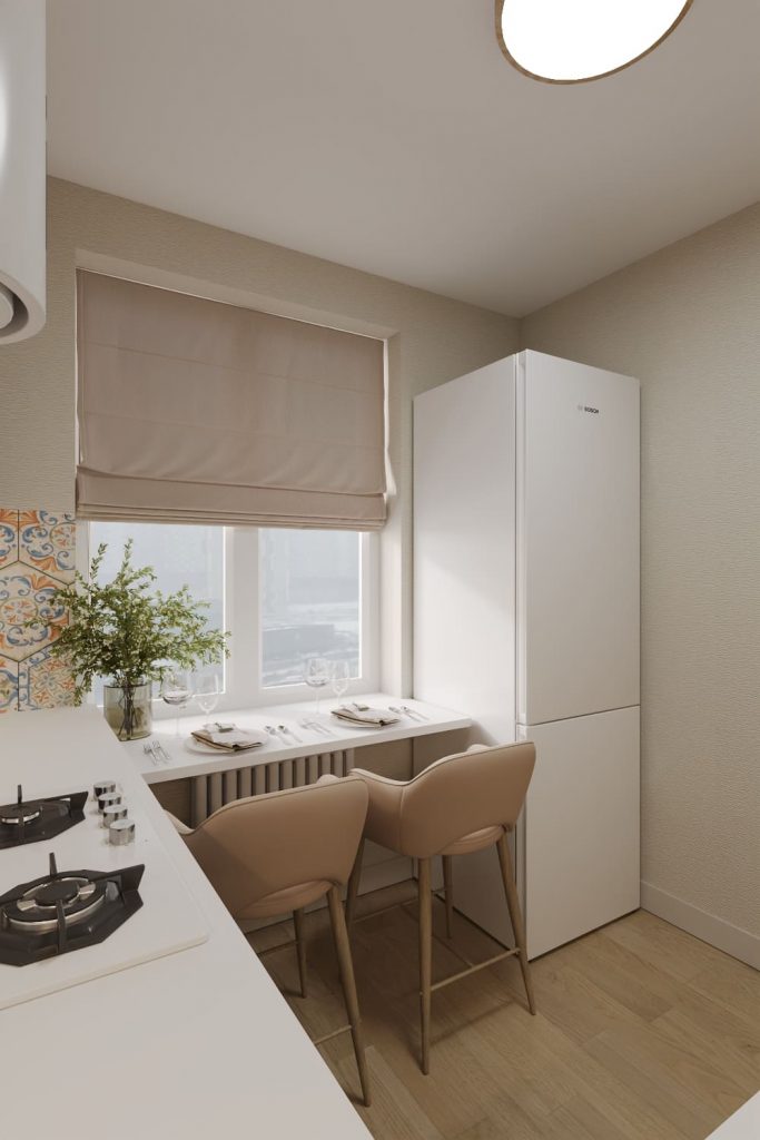 Классический стол здесь заменен барной стойкой у окна — стильное и практичное решение для небольшой кухни. Такое расположение делает завтрак или вечерний ужин особенно приятным, позволяя наслаждаться видом из окна. Уютные мягкие барные стулья добавляют комфорта, а нейтральный текстиль подчеркивает общую цветовую гамму.