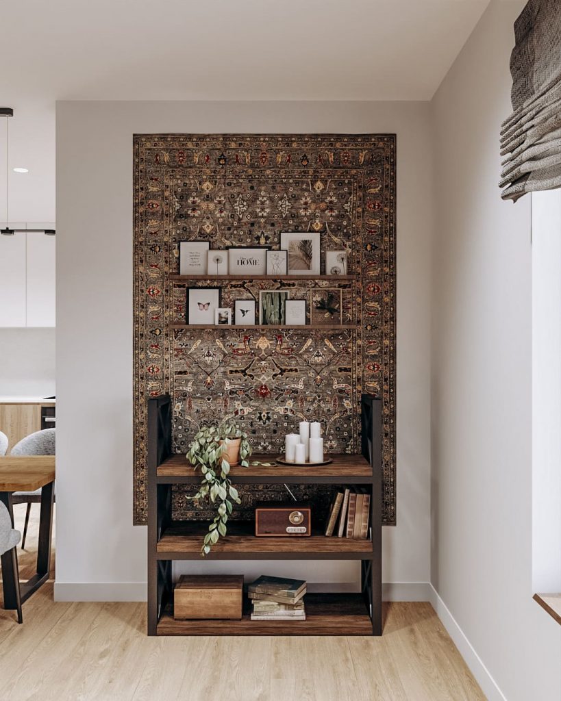 Отдельное внимание — семейному уголку. Ковер на стене и полка с фото и открытками рассказывают личную историю и добавляют интерьеру тепла. Этот акцент — дань армянским корням супруга.