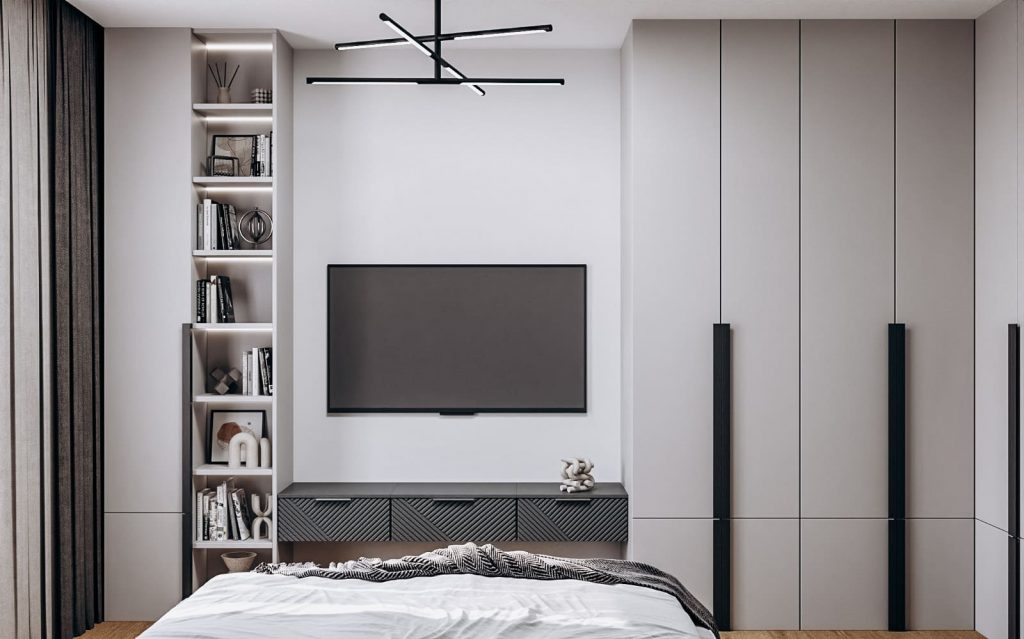 Мы встроили в композицию телевизор, чтобы не загромождать пространство и оставить максимум воздуха.
