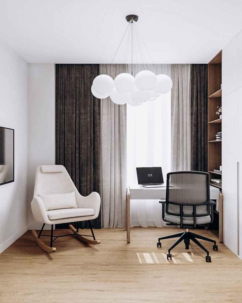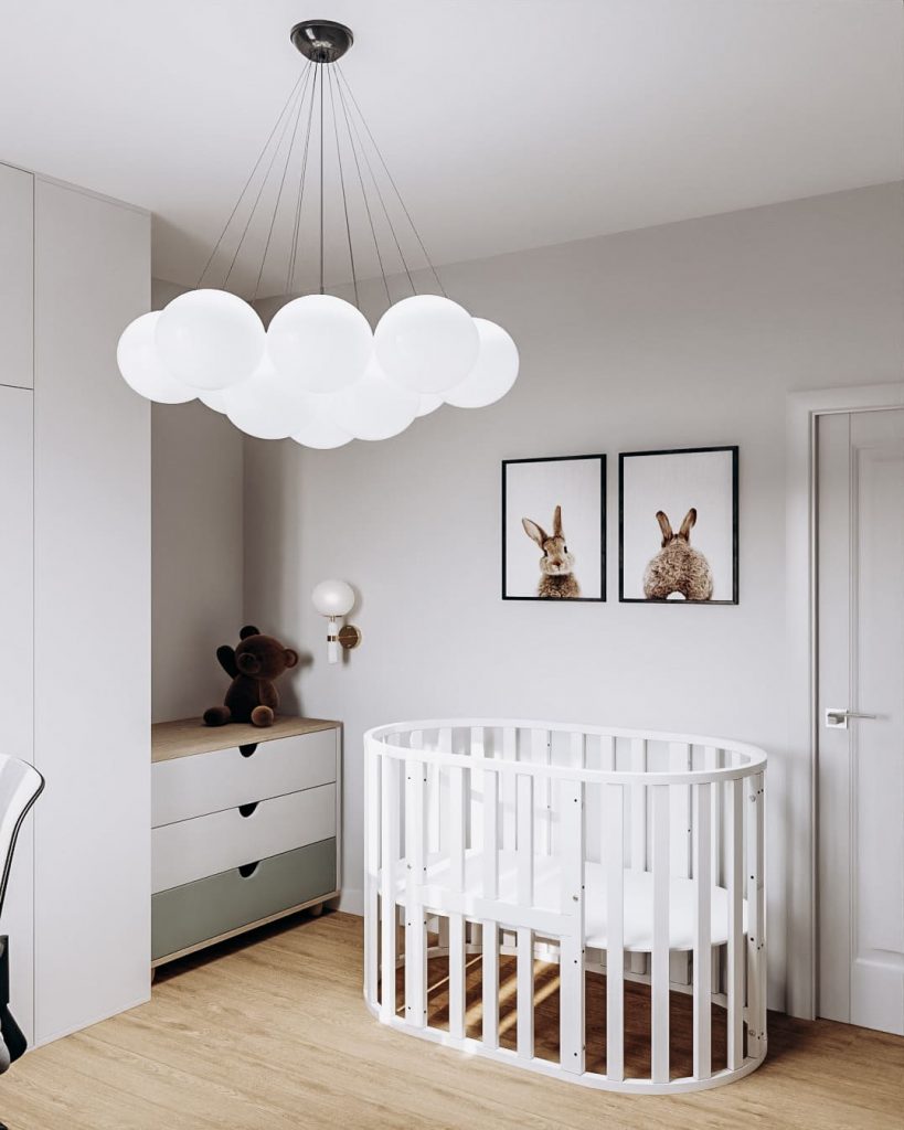 Отдельное внимание — освещению. Люстра в форме воздушных шаров добавляет легкости, а сочетание дневного света и плотных штор позволяет регулировать освещение в любое время суток.