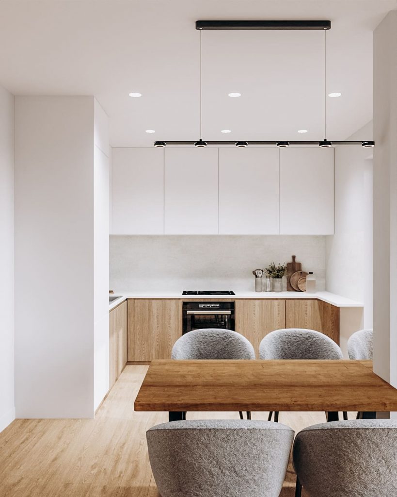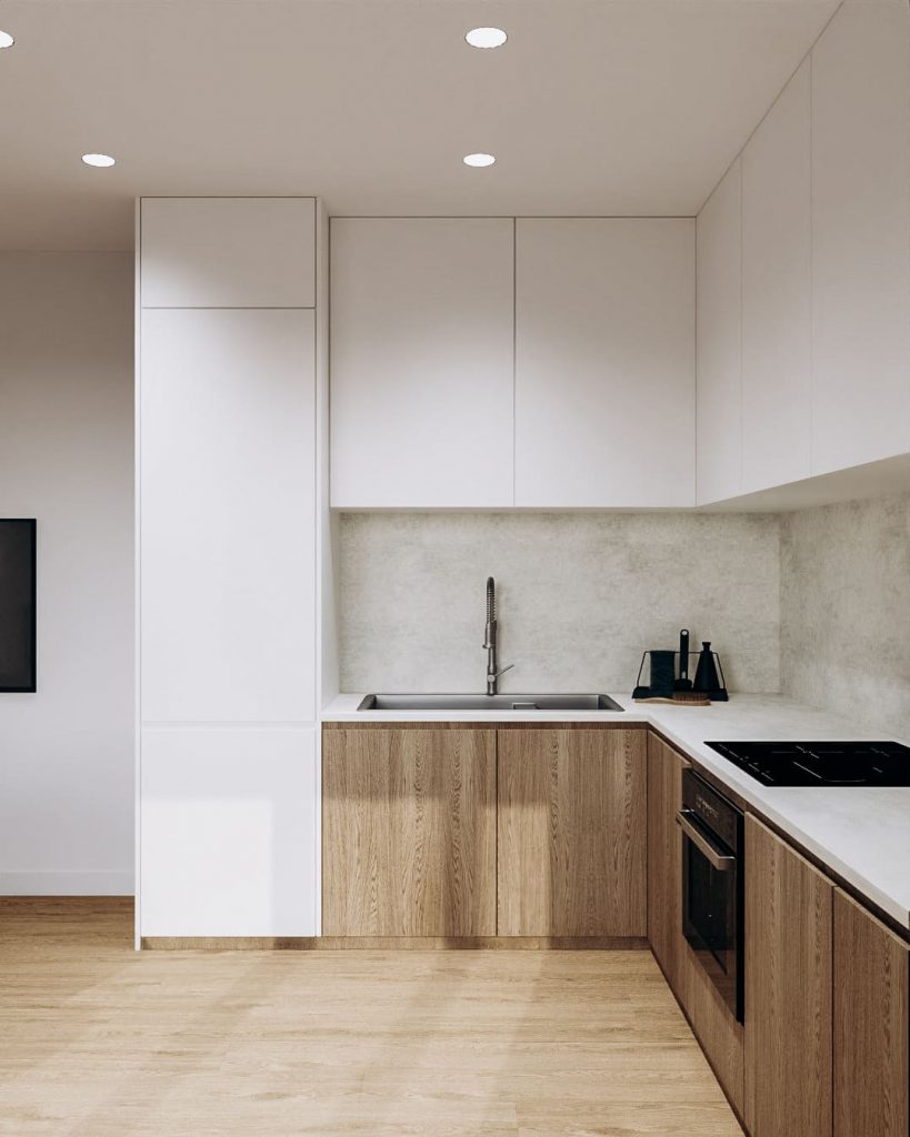 Нижние фасады — под светлое дерево, верх — глухие белые, без ручек. Такой приём делает кухню визуально лёгкой, не перегружая пространство. Рабочая поверхность — сплошная, без разрывов, что удобно и для готовки, и для работы.