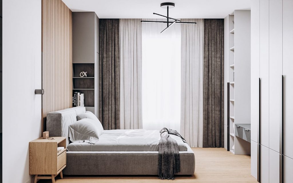 Фокус — на стене за изголовьем: вертикальные деревянные рейки добавляют фактуру и визуальный ритм, а серое мягкое изголовье поддерживает идею объёма и тактильности. Чёрные акценты в светильниках и ручках перекликаются с лофтовыми мотивами, которые заказчики особенно любят.