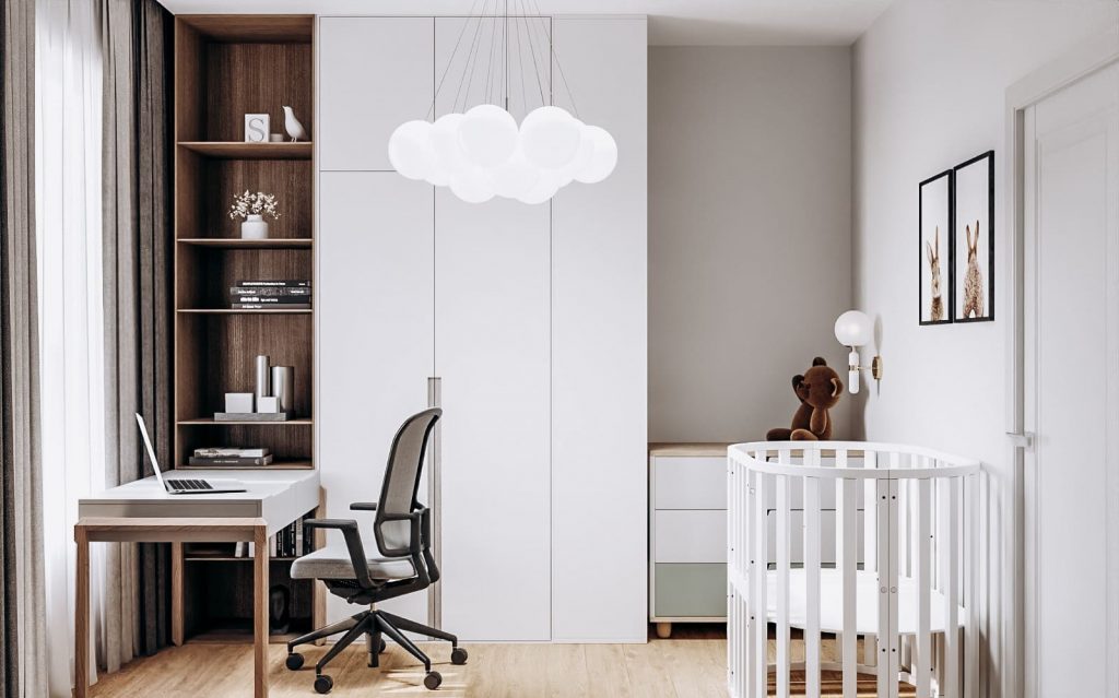 Это пространство мы спроектировали как многофункциональную комнату: зона для будущего малыша и полноценное рабочее место для одного из родителей. Комната светлая, с нейтральной палитрой, которая легко адаптируется по мере взросления ребёнка.