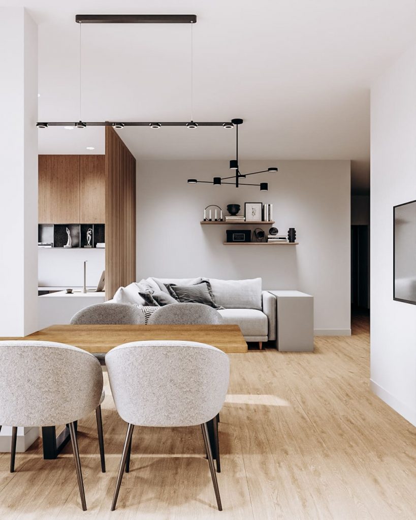 Обеденная зона объединена с гостиной. Деревянный стол и мягкие серые кресла создают уютную атмосферу для вечерних посиделок. За спинкой дивана — встроенное хранение: функциональное решение, появившееся благодаря сложной планировке.