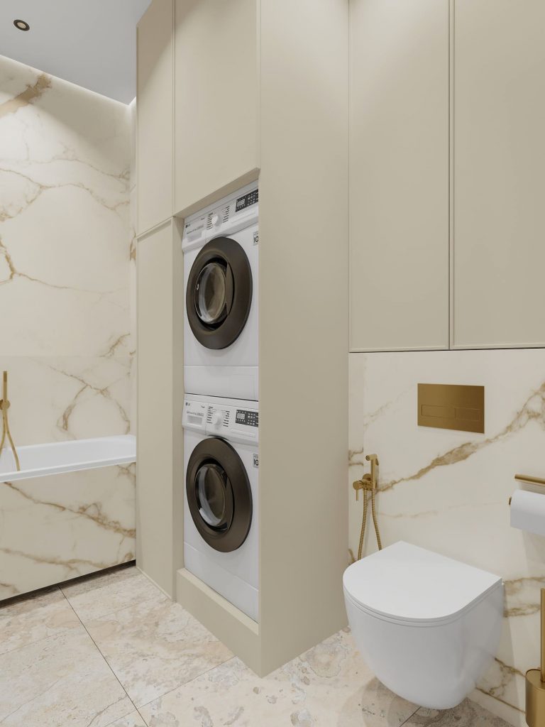 Золотая сантехника гармонично дополняет теплую цветовую гамму всей квартиры и подчеркивает современный стиль ванной комнаты. Подвесная тумба с рифленой фасадной панелью добавляет текстурности и интересный визуальный акцент, а также обеспечивает необходимое пространство для хранения. Такое сочетание материалов и деталей создает ощущение роскоши и комфорта, что обязательно оценят арендаторы.
