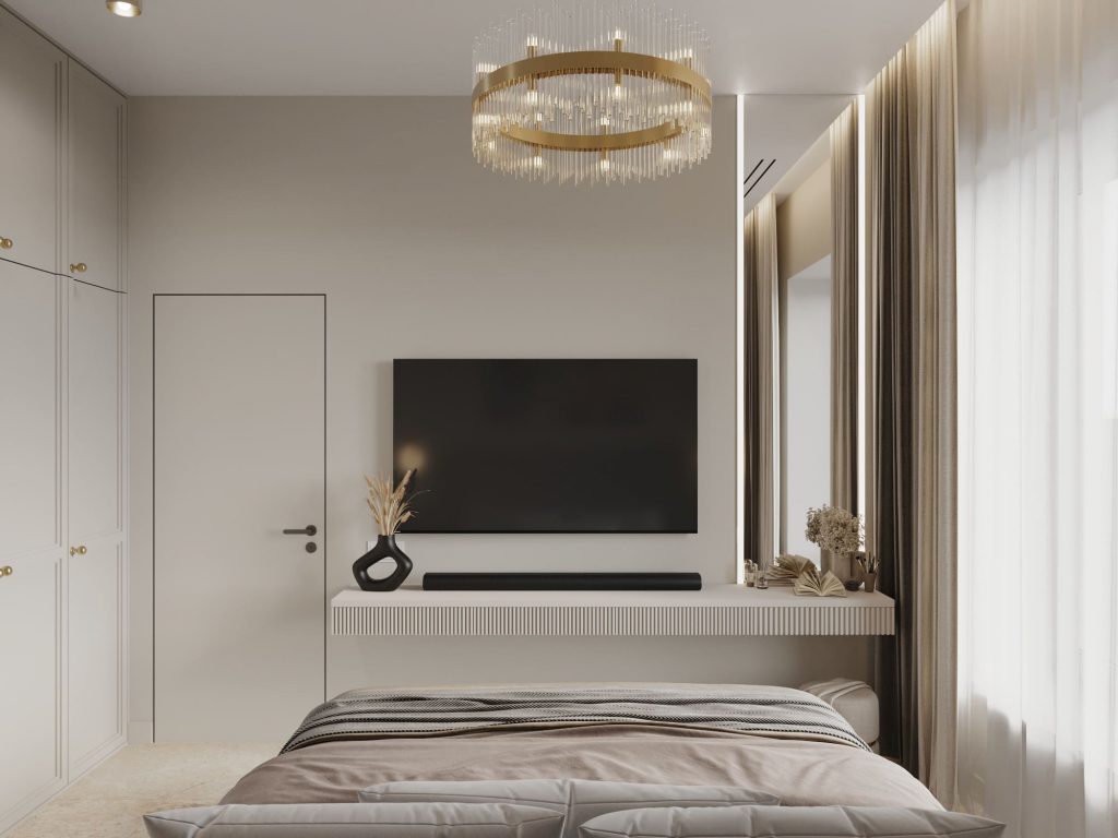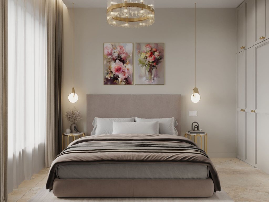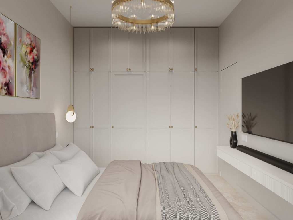 Золотые подвесы по бокам кровати создают симметрию и мягко освещают зону отдыха, добавляя нотку элегантности и изысканности. Встроенные шкафы с лаконичными фасадами оптимизируют хранение и сохраняют целостность пространства, что особенно важно для компактных апартаментов. Изящный светильник на потолке с подвесками завершает образ, добавляя немного блеска и делая интерьер спальни завершенным.