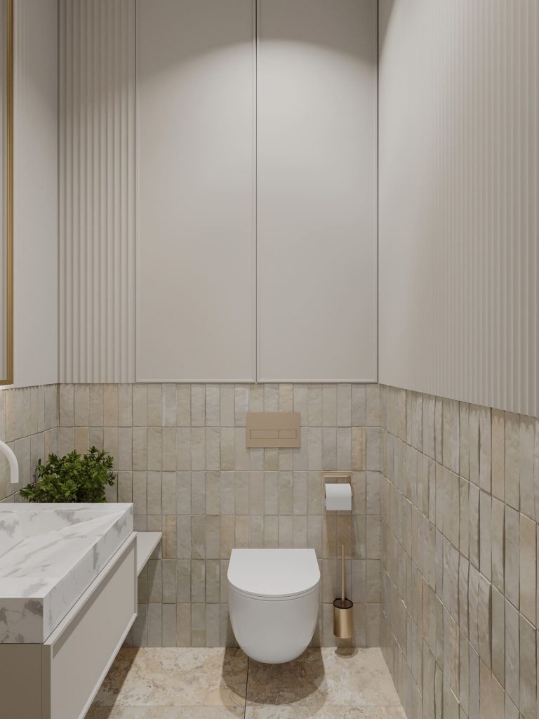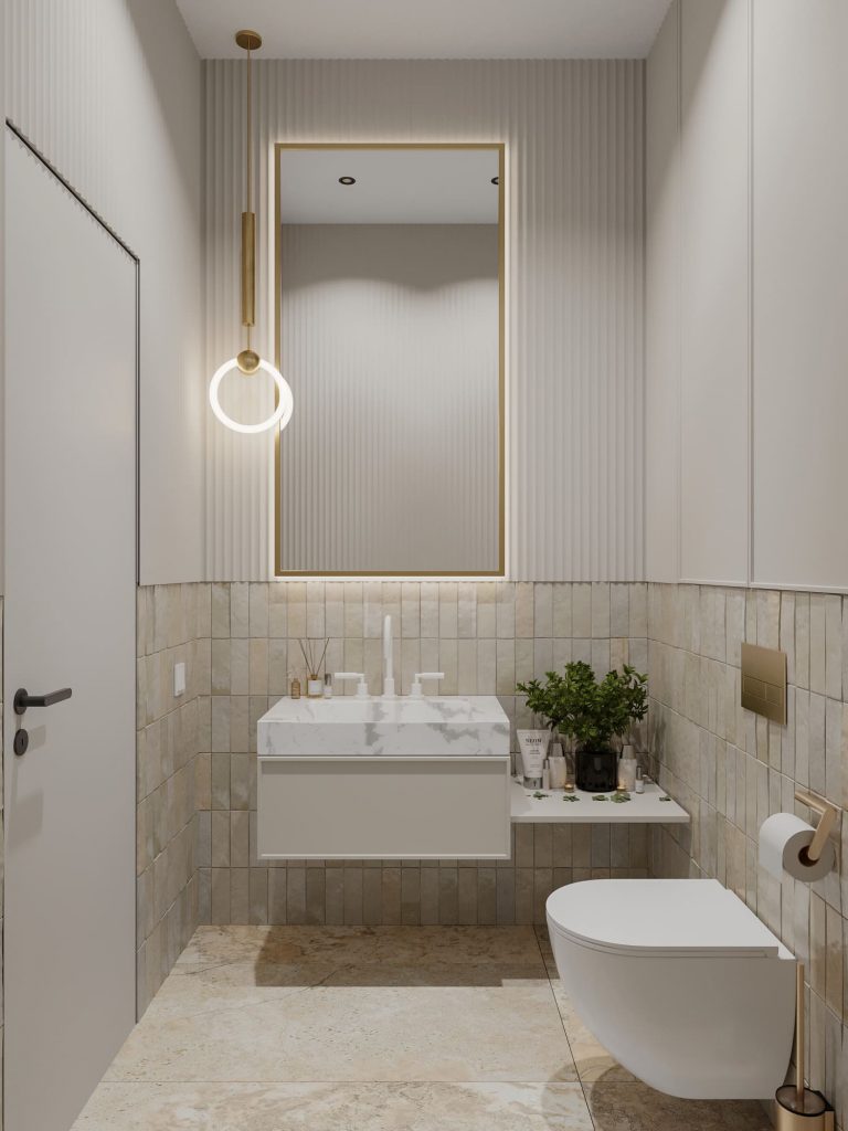 Золотистая фурнитура служит изящным акцентом, гармонируя с общей цветовой палитрой и придавая санузлу элегантность. Вертикальные рифленые панели на стенах добавляют динамику и глубину, а подвесной светильник с круглым элементом создает мягкое, рассеянное освещение, усиливая ощущение уюта.