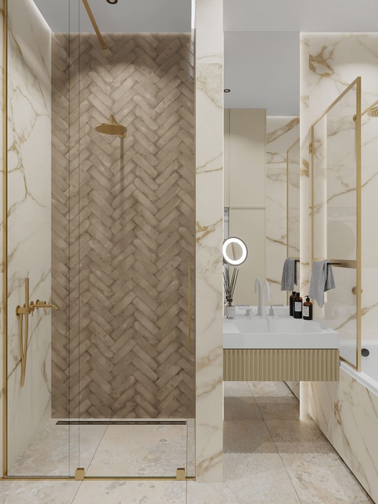 Мы оформили ванную комнату с использованием плитки с мраморным узором. Это решение создает эффект монолитности и добавляет пространству легкий блеск, визуально расширяя помещение. Душевая зона выделена укладкой плитки "ёлочкой", что подчеркивает контраст и придает интерьеру динамику.
