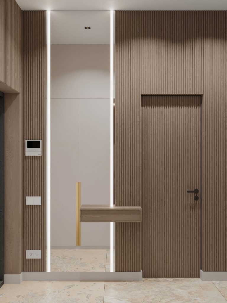 Разрабатывая дизайн апартаментов, предназначенных для комфортной аренды, мы стремились создать пространство, которое понравится как молодым парам, так и студентам, ценящим современный стиль и функциональность. Понимая важность первого впечатления, мы особое внимание уделили прихожей. Вертикальные деревянные рейки на стенах придают ей элегантность и визуально увеличивают высоту потолков, создавая ощущение простора.