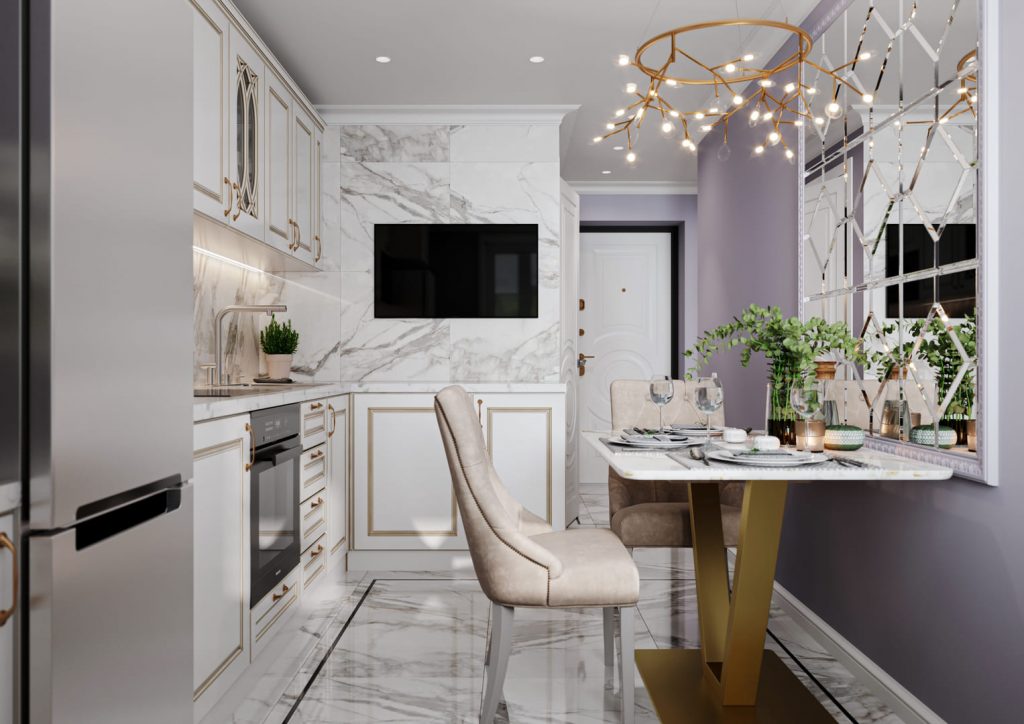 Дизайн однокомнатной квартиры для молодой девушки в стиле современная классика с прихожей, кухней, спальней, балконом и санузлом