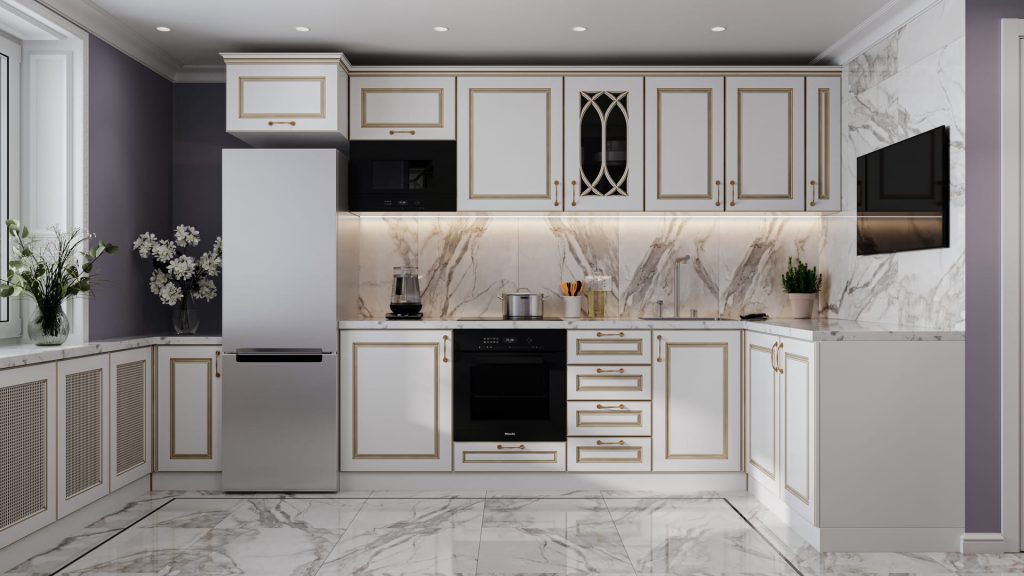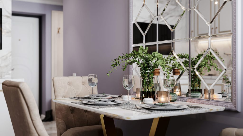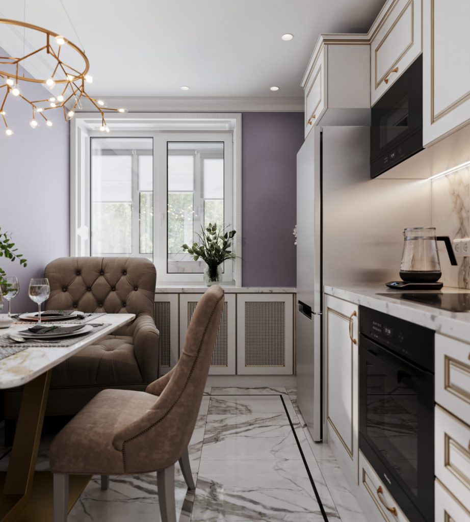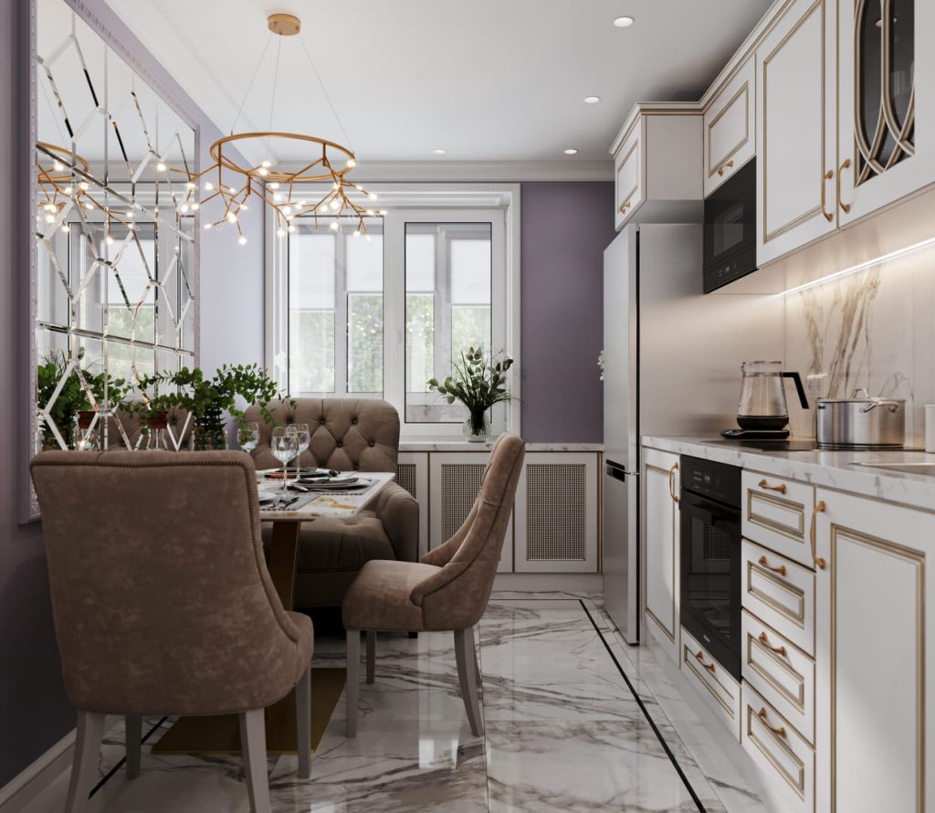 В кухне находит продолжение выбранная стилистика оформления квартиры - гармоничное сочетание сиреневого и белого, классики и современности. Тут - всего две зоны: кухня и обеденная.