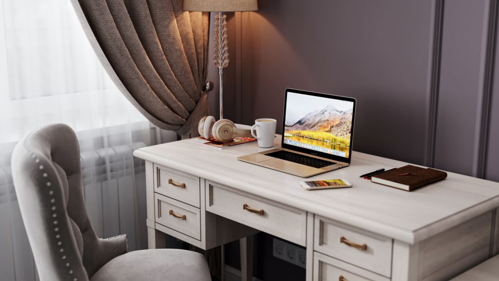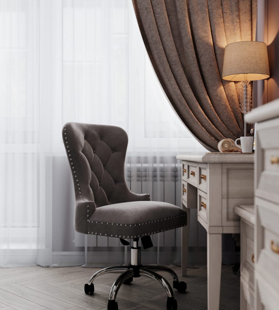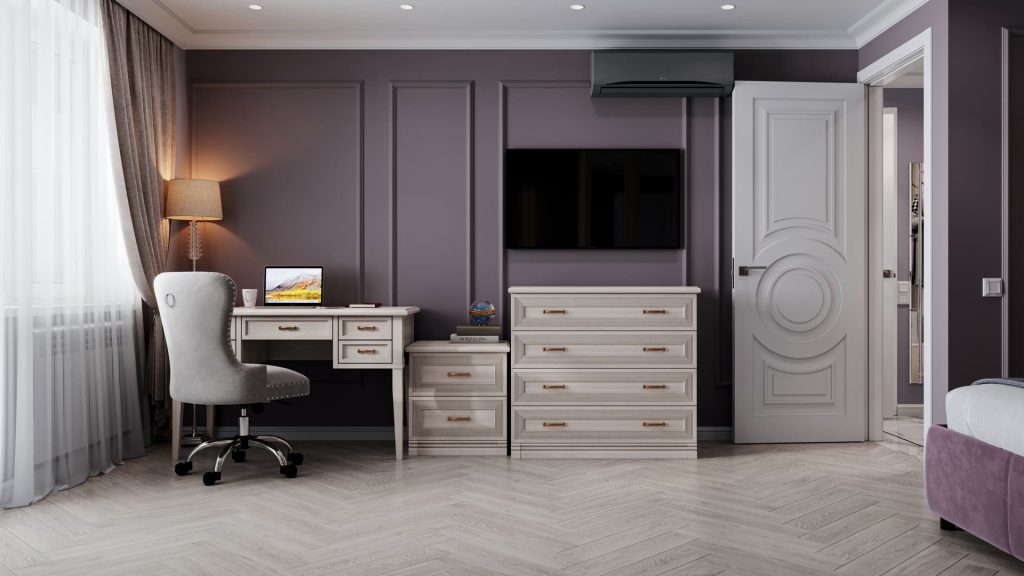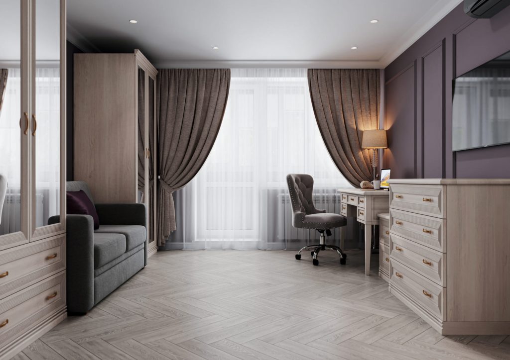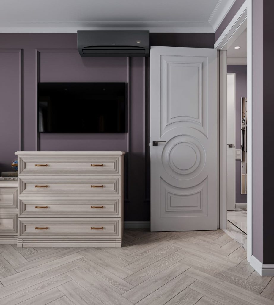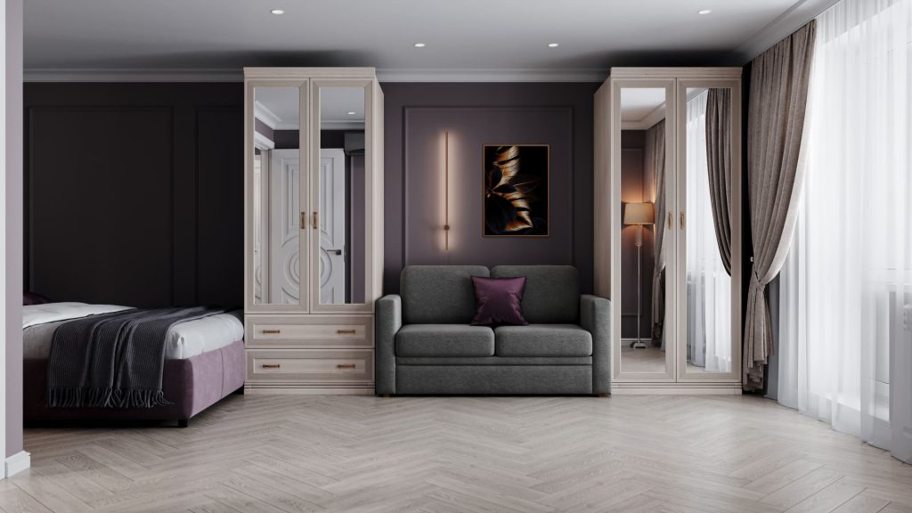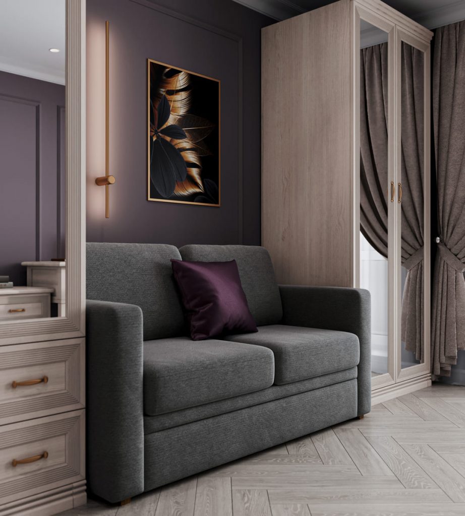 Первая - большая удобная кровать с полностью мягкой фиолетовой отделкой - и изголовьем, в том числе, что добавляет нотку женственности в интерьер, и цилиндрический прикроватный столик-тумба. Зона отдыха - компактный серый диван и ТВ панель с высоким белым комодом с четырьмя выдвижными секциями напротив. Мини-кабинет представлен белым консольным классическим столом (с выдвижными ящиками) в таком же стиле, как ТВ тумба, и удобным компьютерным креслом. Система хранения гостиной - два больших белых шкафа с левой и правой сторон от дивана одной стилистики с остальной мебелью в комнате. Тот, что у окна - двухдверный с зеркальным заполнением дверей. А у входа - тоже зеркальный двухдверный, но с нижними выдвижными отделениями. Он зонирует собой кровать от остального помещения. Также, здесь есть небольшая тумбочка с двумя выдвижными ящиками между мини-кабинетом и комодом.