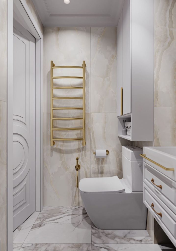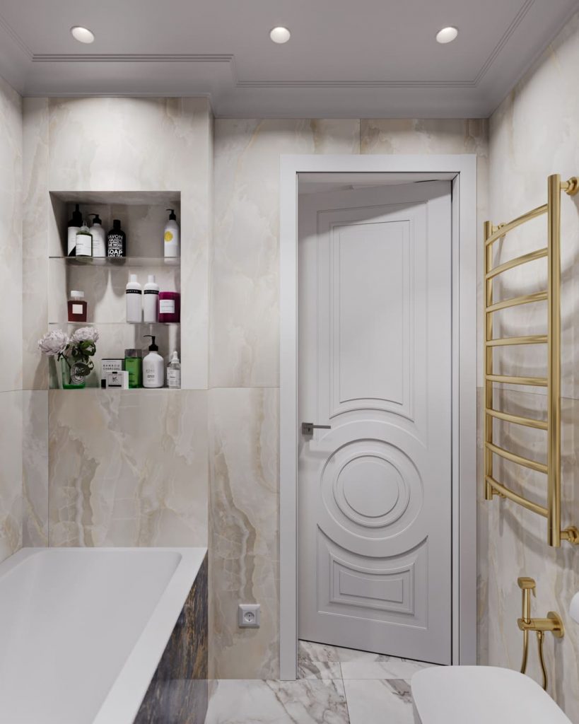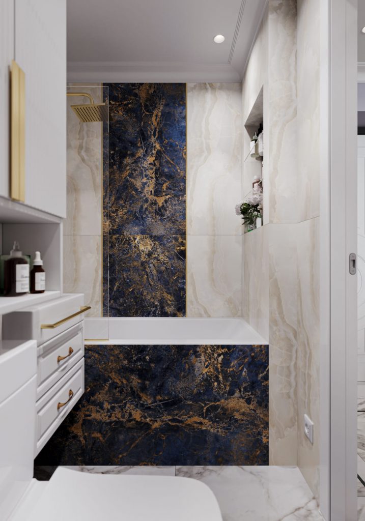 Небольшая роскошная ванна включает все функциональные составляющие, требующиеся в этом помещении: ванну, раковину с подвесной тумбой с выдвижными ящиками и зеркалом, подвесной унитаз, полотенцесушитель. Система хранения здесь - встроенные стеклянные полки в нише над ванной и встроенная полка-секция над унитазом. Тихой роскоши интерьеру добавляют акценты в виде тёмно-синего с золотом керамогранита, которым отделан экран под ванной и вставка на стене над ней и золотистая отделка аксессуаров и приборов - ручек мебели, рамы зеркала, смесителя, гигиенического душа, сушителя для полотенец.