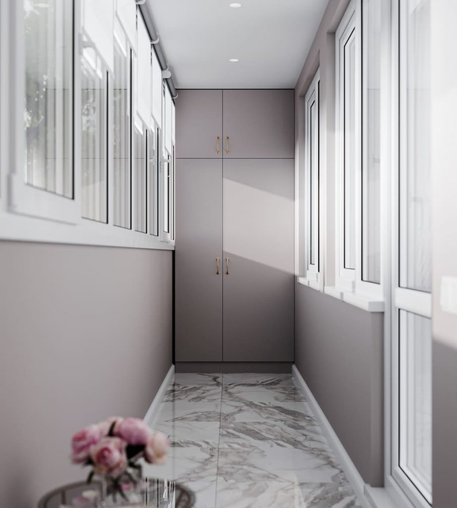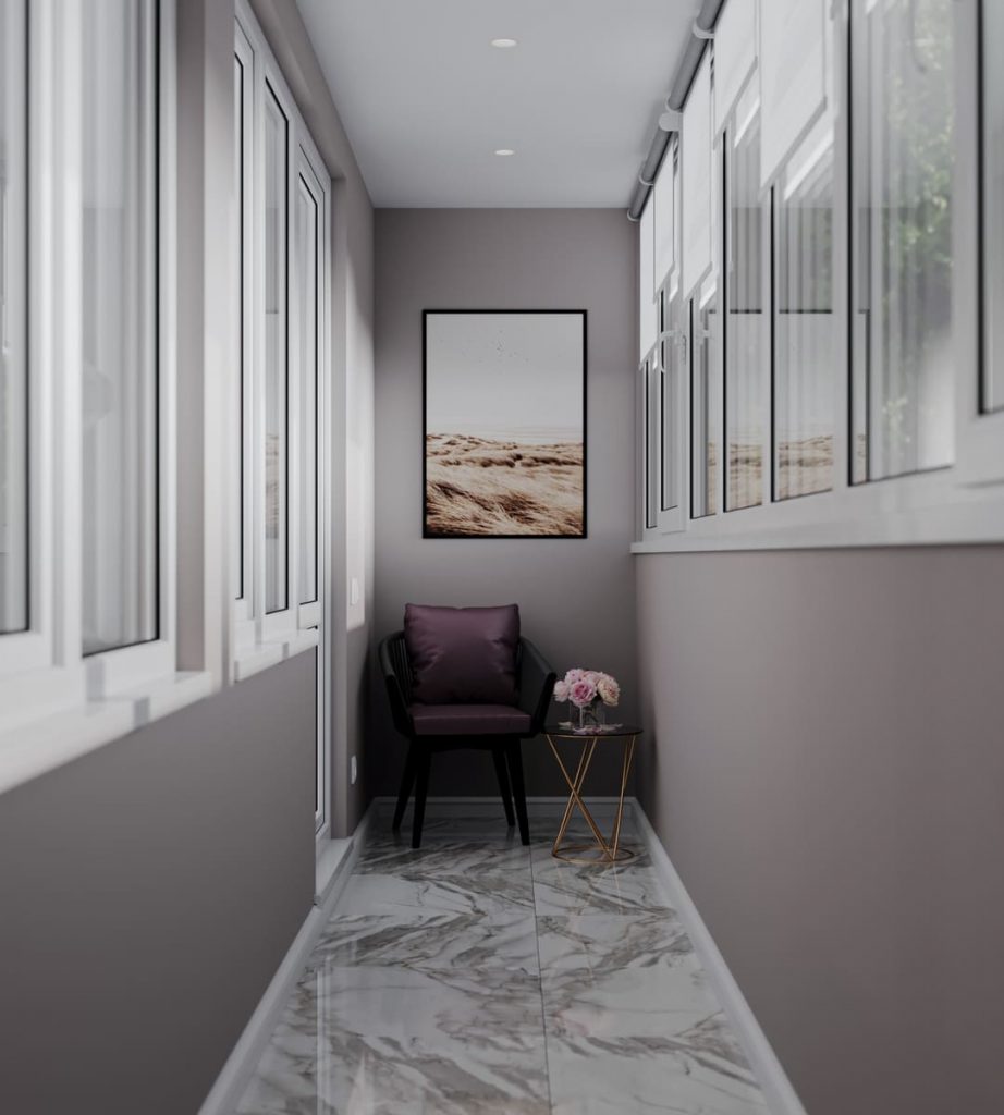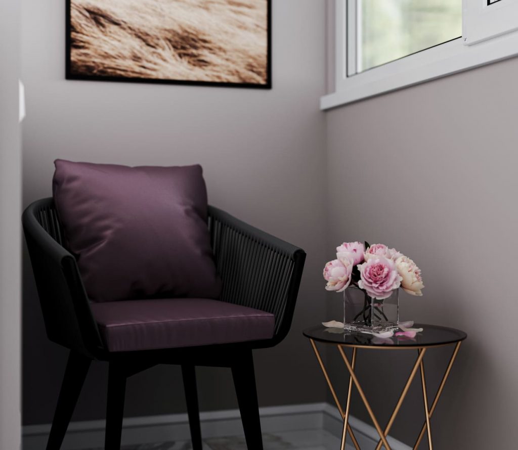 На лоджии расположились: очаровательная небольшая зона отдыха в виде стильного фиолетового кресла и красивого кофейного столика, а напротив - система хранения в виде встроенного шкафа. Панно же на тему степей придаёт интерьеру атмосферности и глубины.
