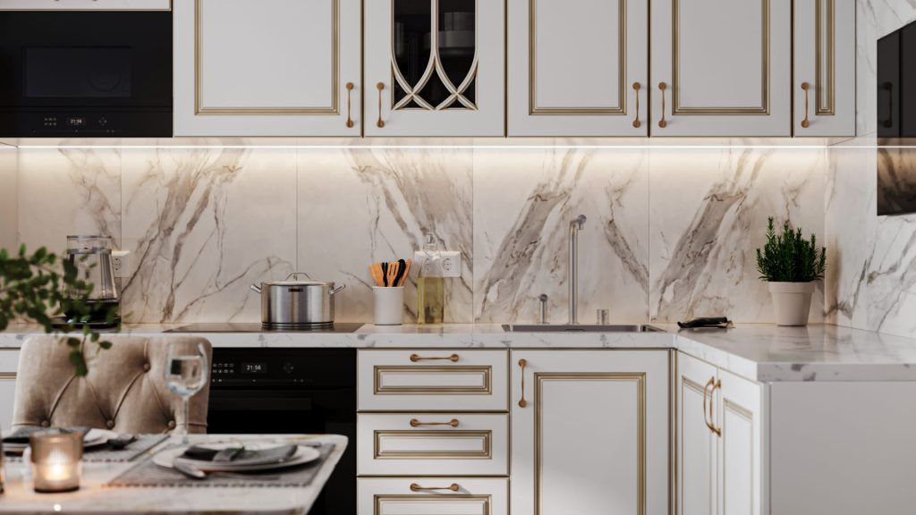 Оригинальности кухне придаёт подоконник, образующий единое целое со столешницей кухни и красивые декоративные экраны для радиаторов под ним, имеющие одинаковую высоту с нижними модулями кухонного гарнитура, что образует гармоничную общую нижнюю линию, добавляющую визуально простора помещению. А тихую роскошь привносит в интерьер тут зеркальное панно за обеденной зоной и авторская люстра над столом.