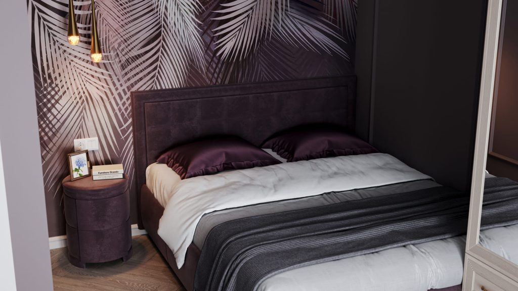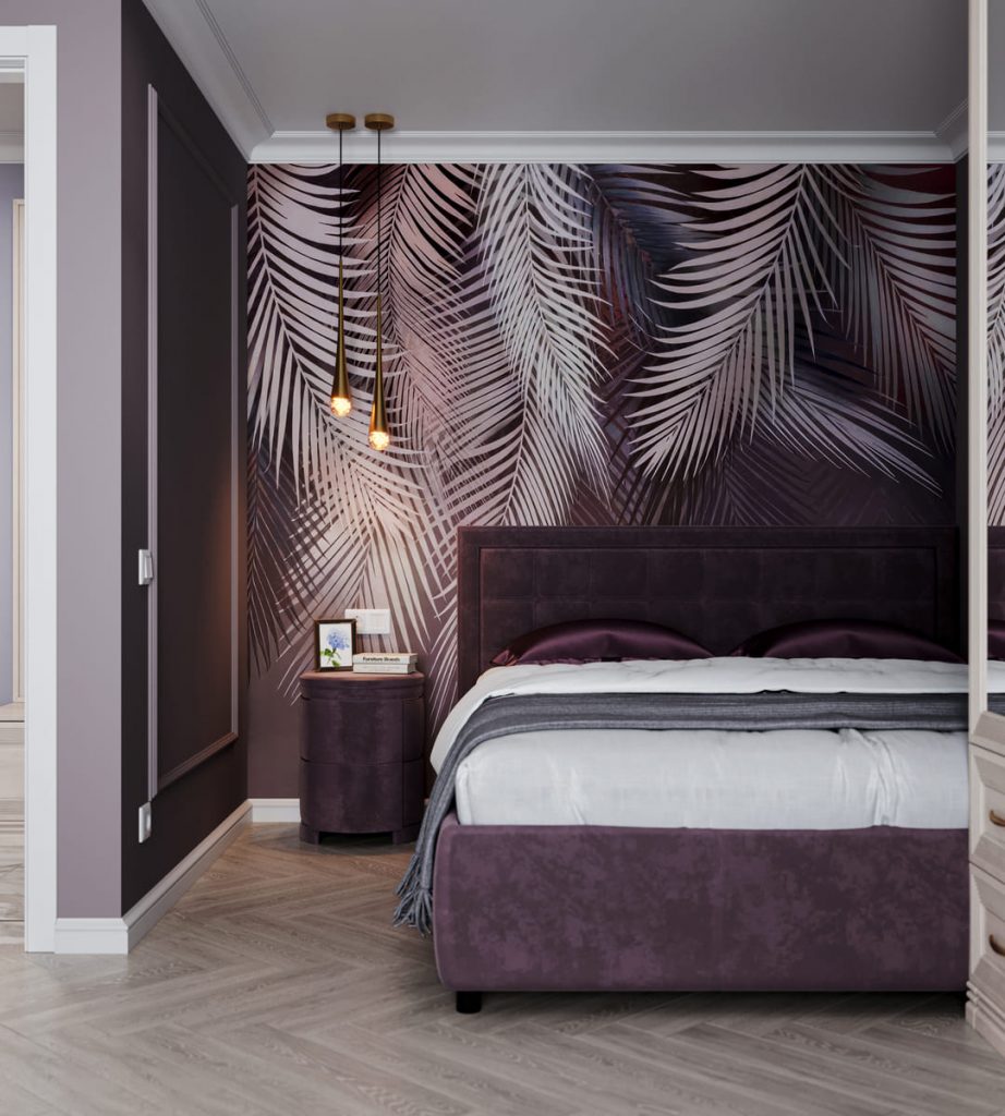 Контраст сиреневого и фиолетового (отделка стен, обивка мебели, аксессуары) с белым (мебель, напольное покрытие) делает интерьер эксклюзивным, тёплое интересное освещение в виде абажура на рабочем столе и подвесных светильников над прикроватным столиком добавляют атмосферности, а роскошный декор над диваном и обои за кроватью на тропическую тему привносят ноту сдержанного шика.