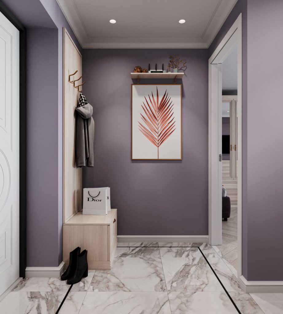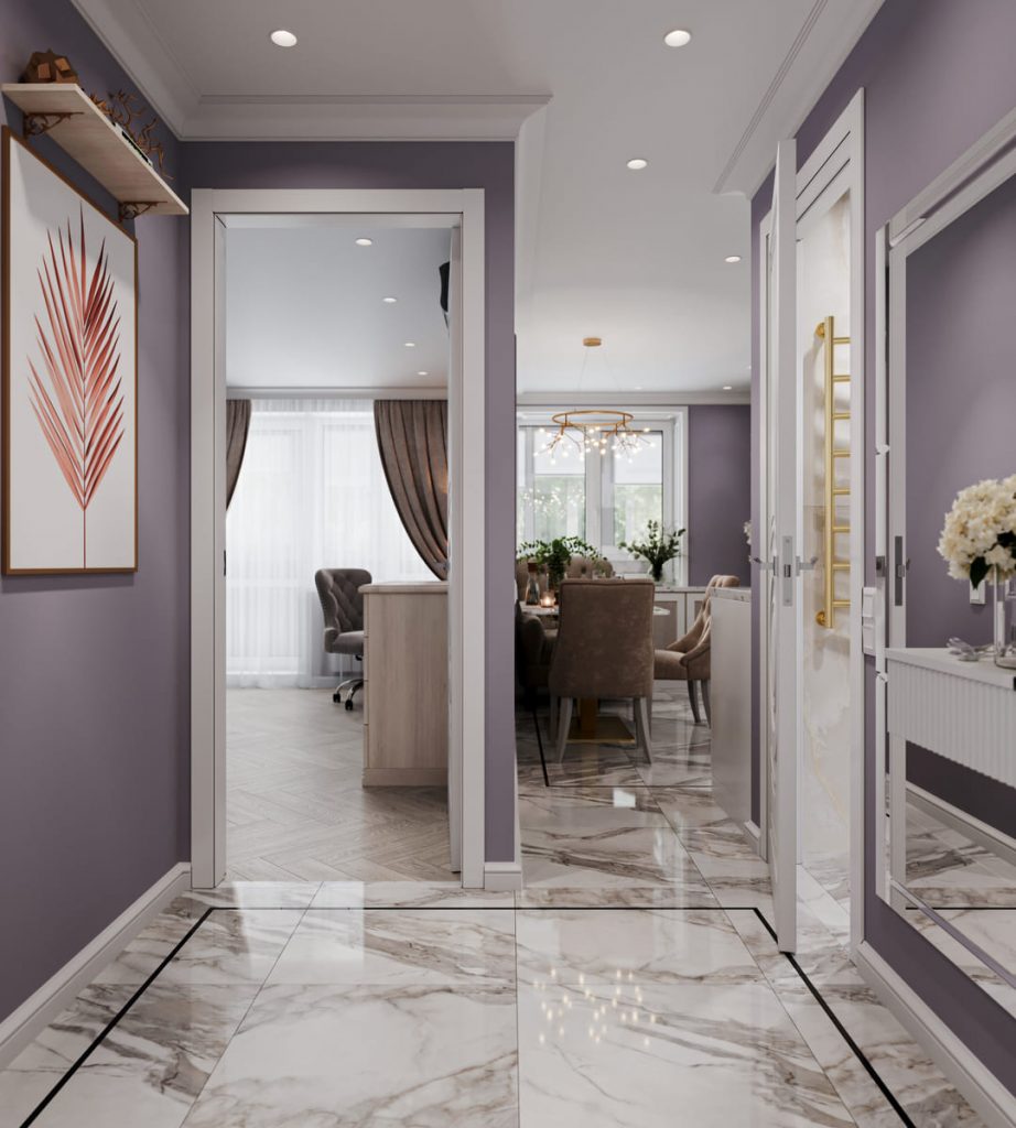 Дизайн-проект этой квартиры составлялся для молодой девушки. Оформлением занимались её родители - владельцы квартиры. Заказчики хотели, чтобы интерьер был сделан в соответствии со вкусами и запросами дочери. Так как эта квартира - вторичное жильё, старый дизайн нужно было полностью обновить. Важным пожеланием заказчиков значилось в жилой комнате разместить полноценную двуспальную кровать, а еще - мягкую зону отдыха, систему хранения и мини-кабинет с рабочим столом. В качестве стиля для оформления была выбрана современная классика и нетипичная холодная бело-сиренево-фиолетовая гамма.