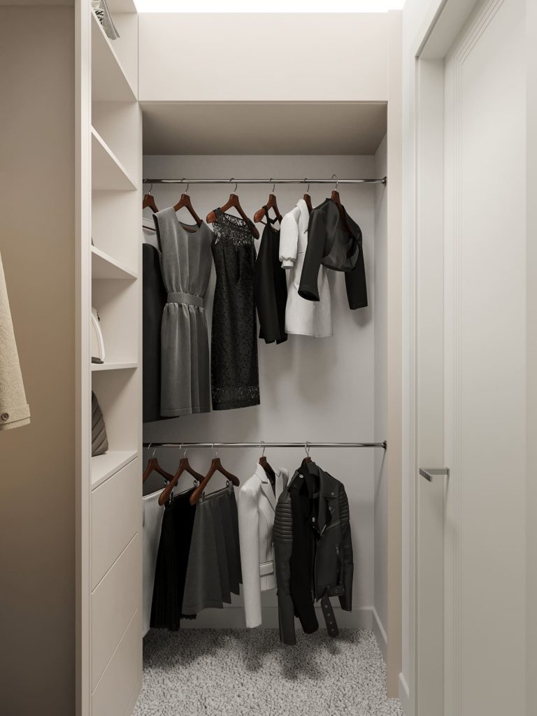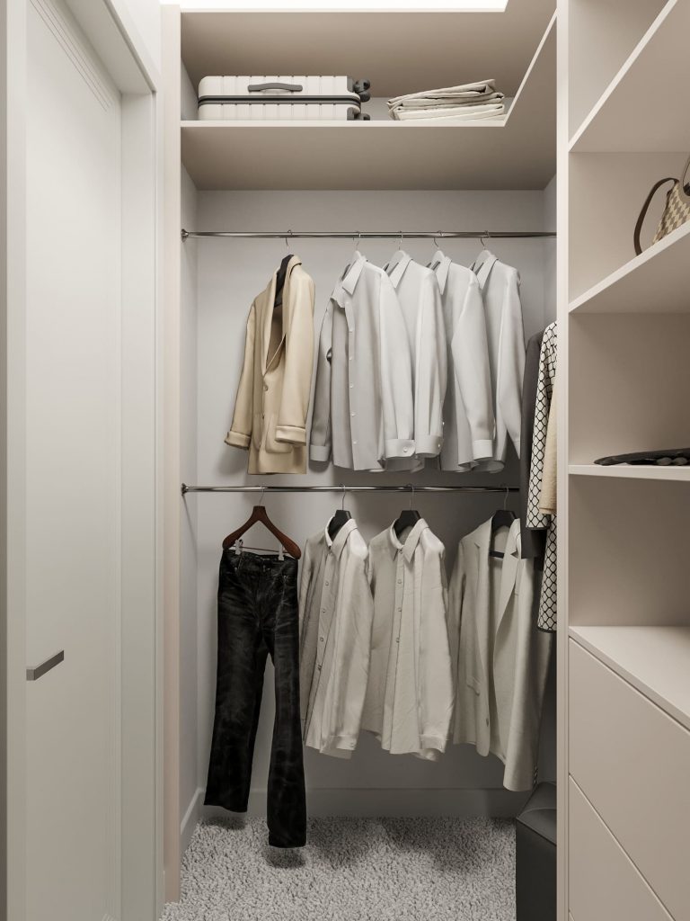 Мы спроектировали гардеробную с П-образной компоновкой, идеальной для разделения сезонной и повседневной одежды, что упрощает доступ к нужным вещам. Мы использовали несколько уровней штанг для одежды — верхний и нижний ярусы. Верхняя штанга предназначена для платьев и пальто, а нижняя — для брюк и рубашек.
