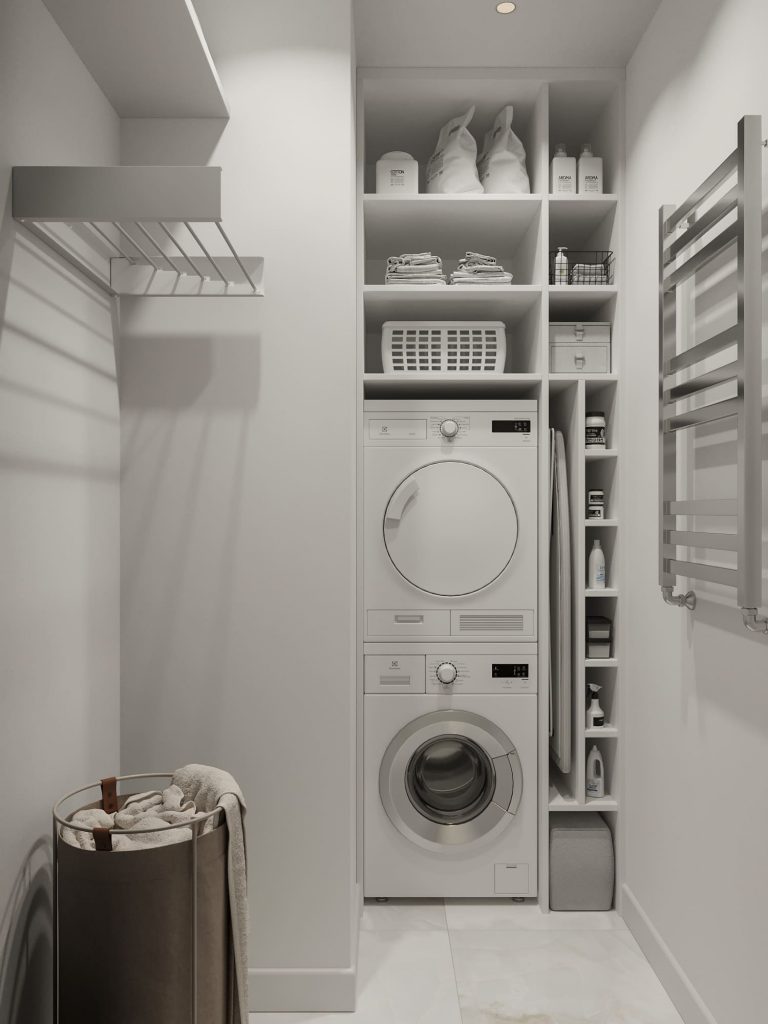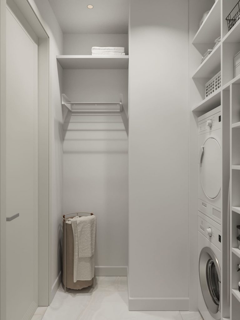 Стремясь к оптимальному освоению доступного пространства, наша команда предложила идеальное решение: вертикальную организацию стиральной и сушильной машины, что освобождает место для дополнительного хранения и использует высоту помещения по максимуму. Комбинируя открытые и закрытые системы хранения, мы добавили верхние полки и ячейки разных размеров для корзин, чистящих средств и аксессуаров. Закрытые шкафы скрывают менее эстетичные предметы, поддерживая порядок и аккуратность.