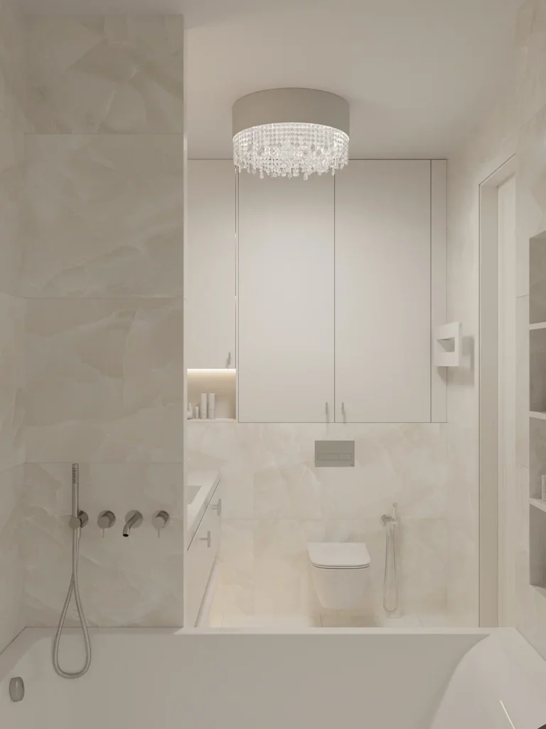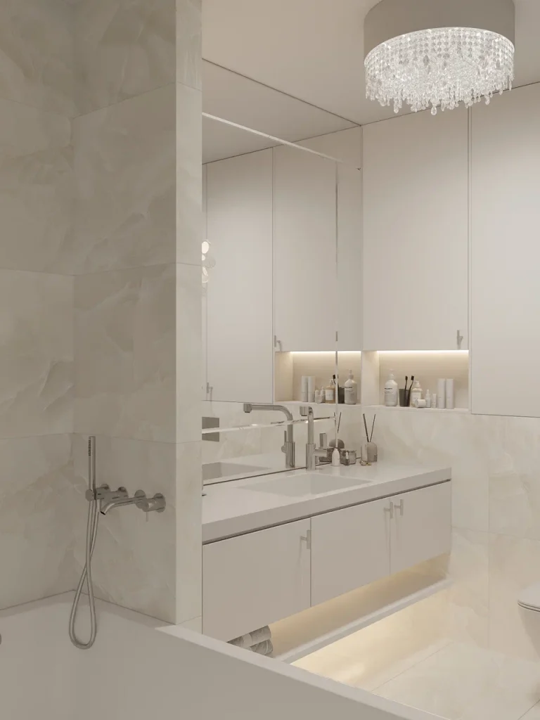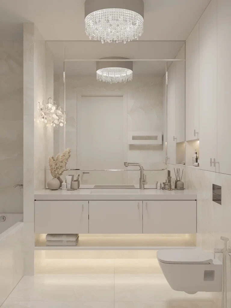 Подсветка под тумбой и в нишах добавляет пространству мягкого света, создавая комфортную обстановку для вечернего отдыха. Светильники с хрустальными элементами на потолке и стенах придают интерьеру элегантность.
