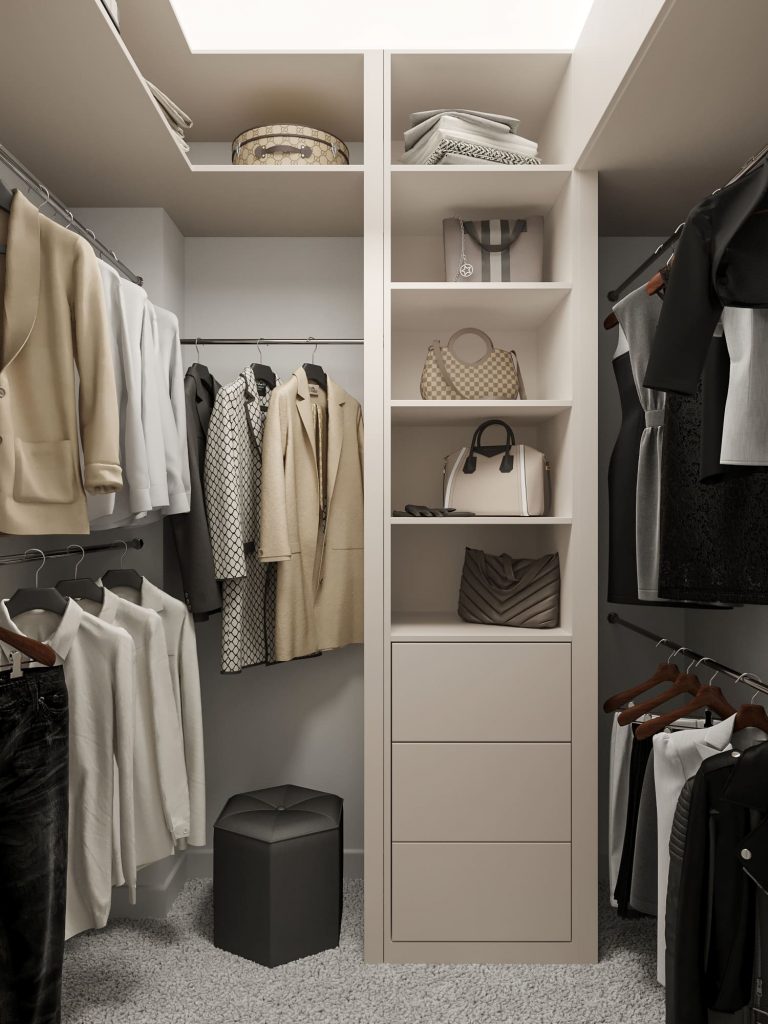Учитывая предпочтения хозяйки по организации пространства, команда Domeo внедрила выдвижные ящики и полки, сочетая открытые и закрытые системы хранения. Выдвижные ящики на оптимальной высоте (около 100 см) обеспечивают легкий доступ к нижнему белью, аксессуарам и мелким предметам. Высота верхних полок (около 180 см) идеально подходит для хранения чемоданов и сезонных вещей, которые используются не так часто. Мы предусмотрели пуф в гардеробной зоне, чтобы процесс переодевания был максимально комфортным и удобным.