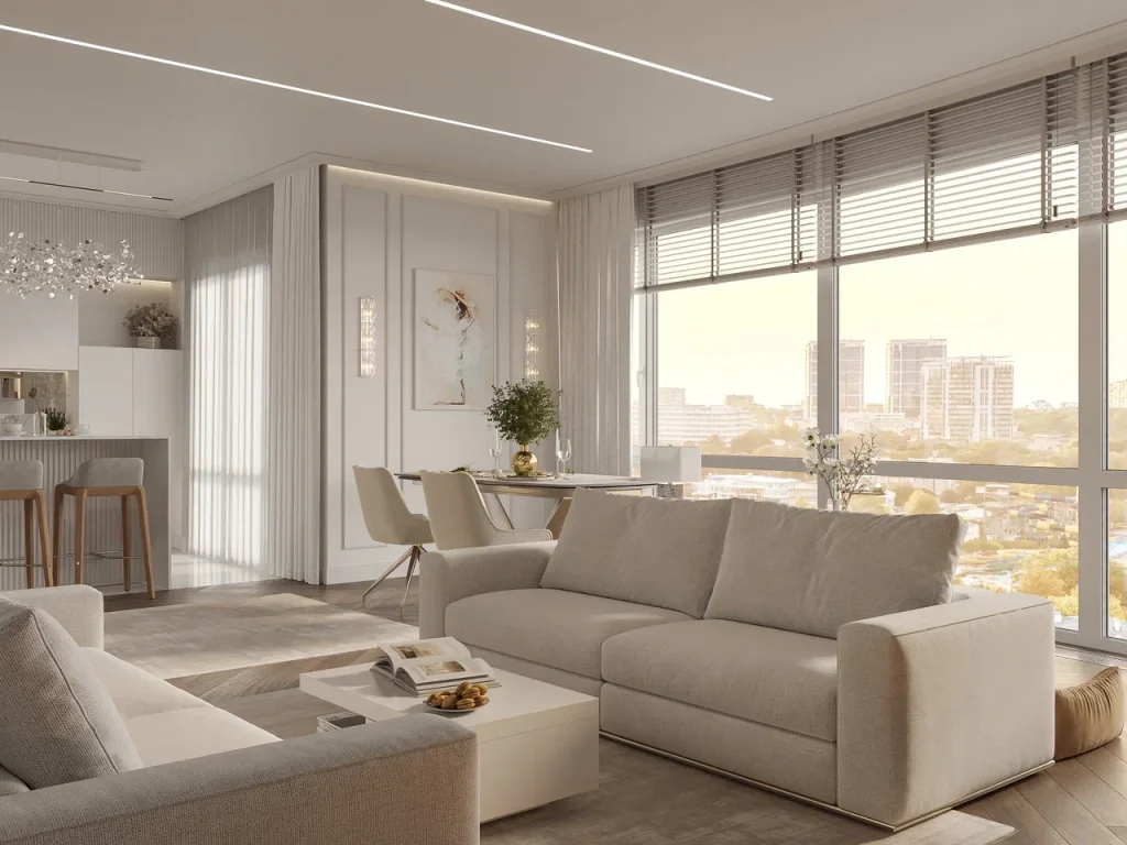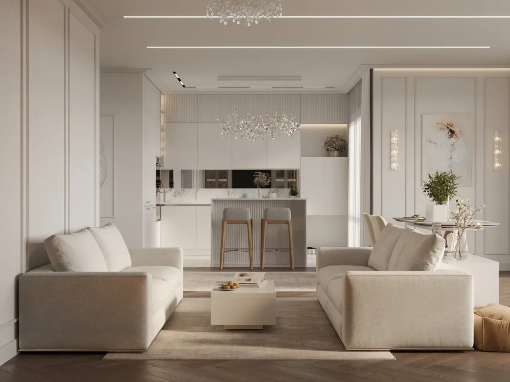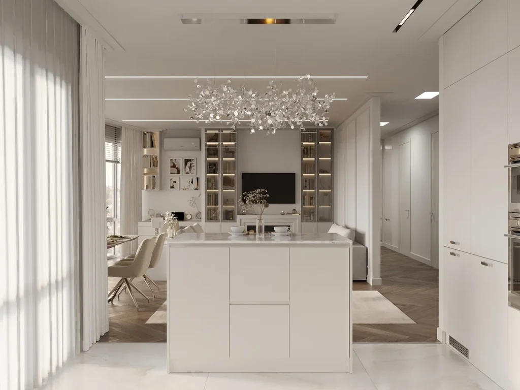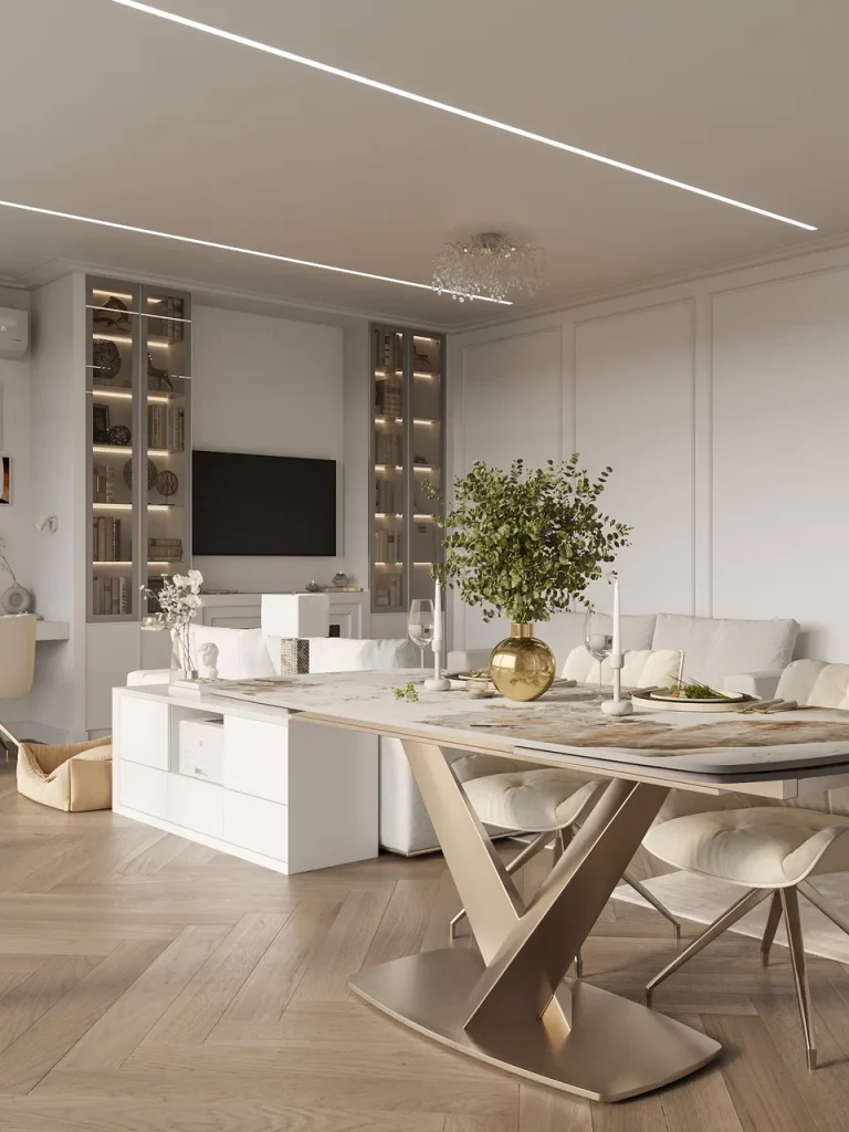 Встроенные светодиодные светильники вдоль потолка обеспечивают равномерное освещение, а каскадная люстра, идеально подобранная командой Domeo для создания уютной зоны над обеденным столом, придает особый шарм вечерним встречам.