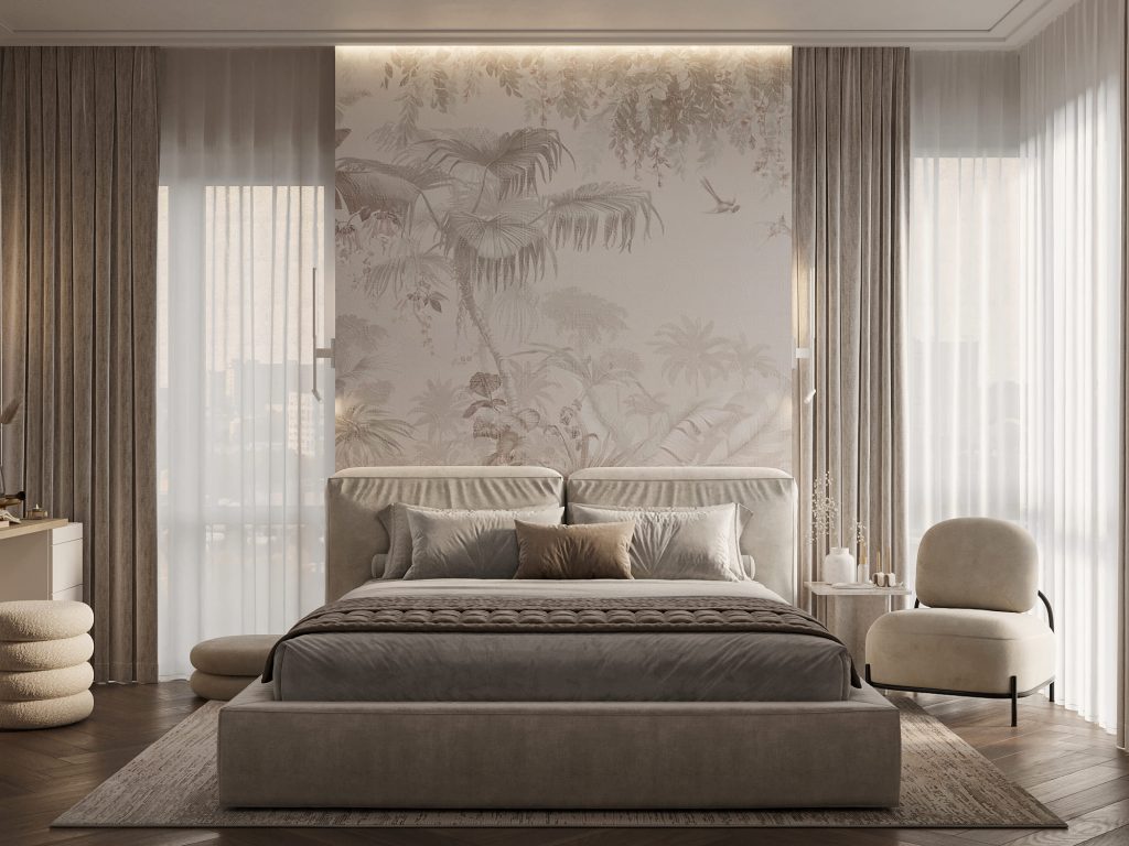 Для придания спальне изысканности мы использовали обои с растительным орнаментом на акцентной стене. Это добавляет интересный визуальный эффект и соответствует пожеланию заказчицы.
