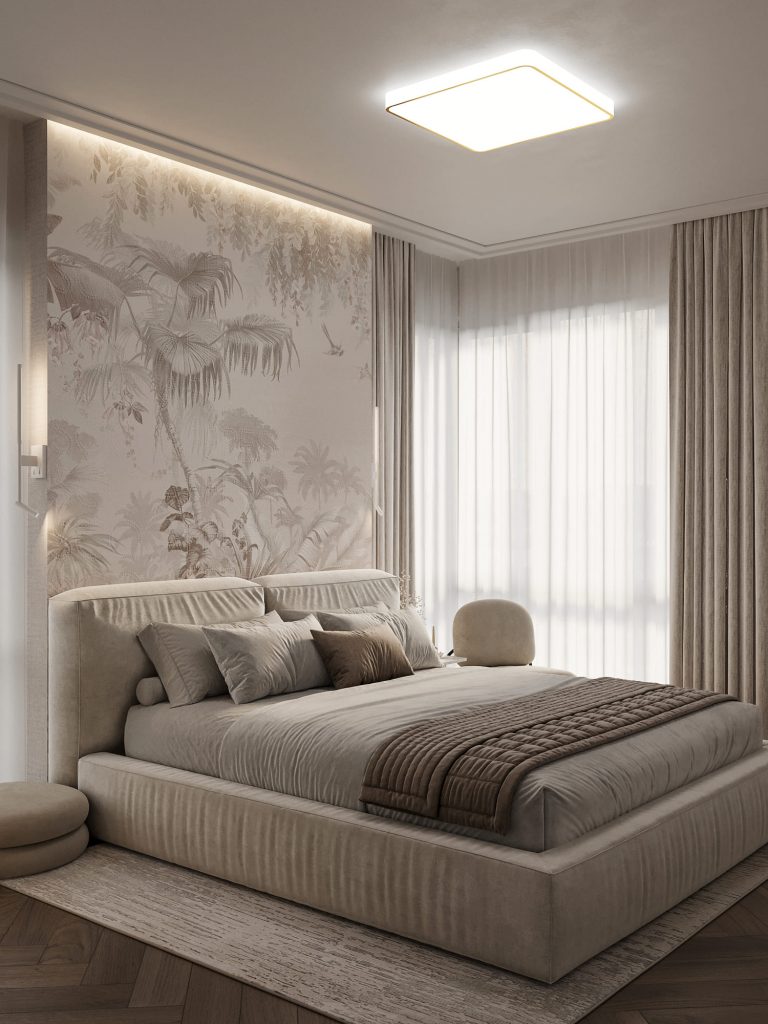 Центральным элементом стала кровать с большим мягким изголовьем с декоративной прострочкой. По периметру мы добавили встроенные подсветки, создающие эффект мягкого и уютного освещения, что особенно ценно в вечернее время. Высота кровати 50 обеспечивает удобство при подъёме и спуске. Вблизи кровати предусмотрено дополнительное пространство для прохода (около 60 см), что удобно для передвижения и уборки.