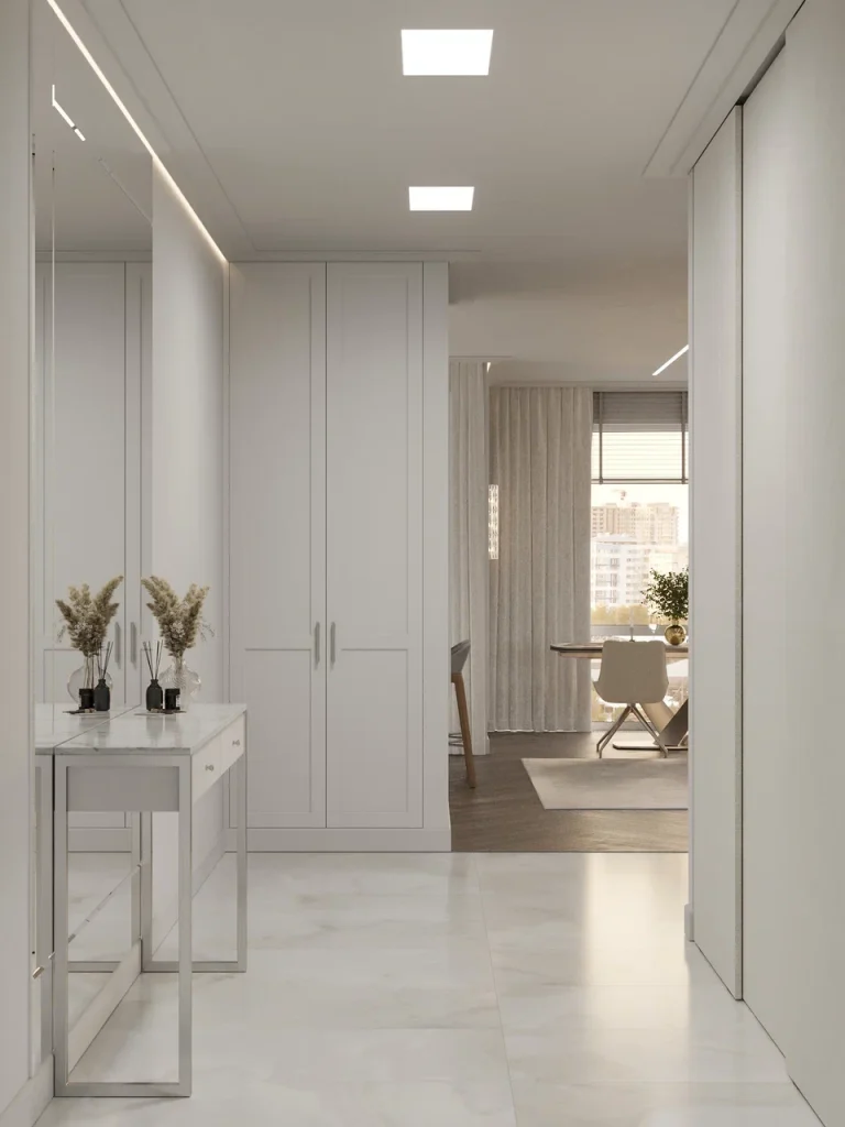 Двухкомнатная квартира во вторичке для взрослой женщины в современном стиле в белых тонах, с прихожей, большим холлом, кухней-гостиной, спальней, гардеробной, постирочной и двумя санузлами.