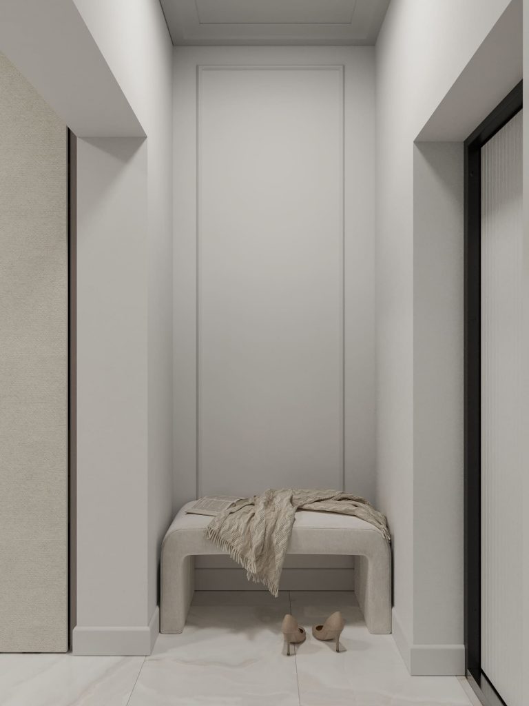 Пол выложен керамогранитом с имитацией мрамора для эстетики и удобства в уходе, обеспечивая долговечность, а мягкая скамья у двери предоставляет удобное место для сидения при смене обуви или ожидании, делая прихожую более гостеприимной и функциональной.
