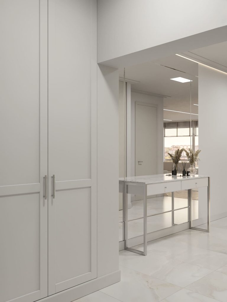 Для подчеркивания современного стиля интерьера, наша команда выбрала гладкие фасады шкафов с молдингами. Решение украсить коридор декоративной панелью с изображением льва пришло от нас как способ создать яркий акцент и добавить индивидуальности общему пространству, исходя из общих впечатлений о предпочтениях хозяйки.