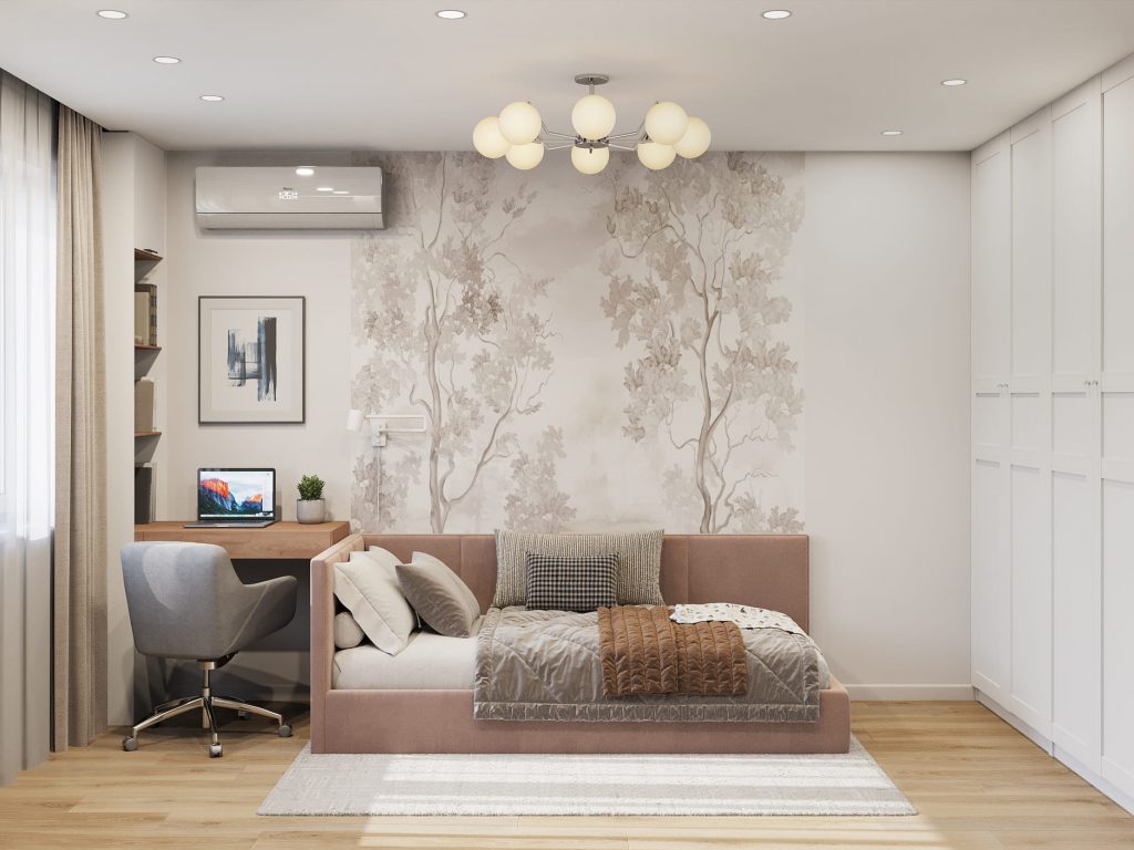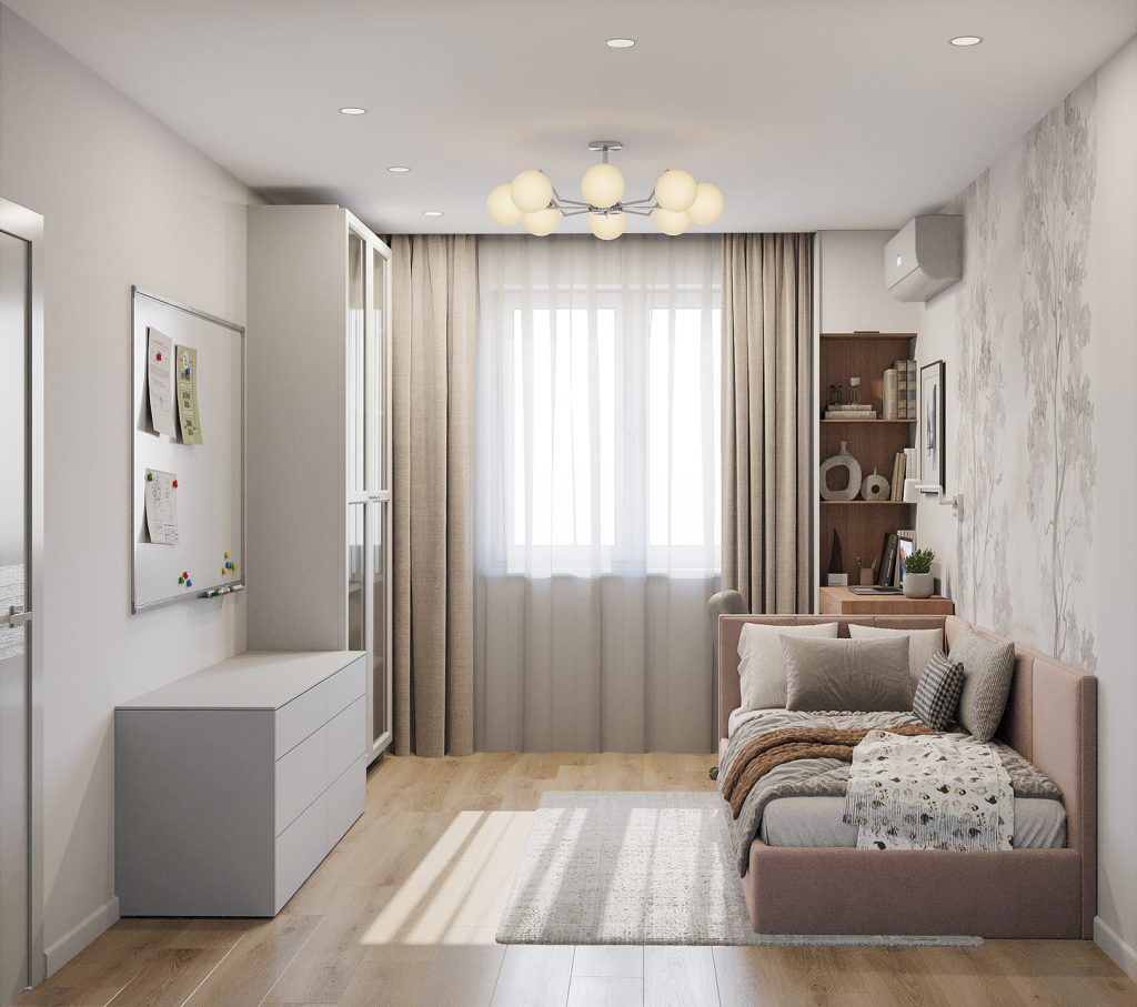 Центральное место занимает мягкая кровать-диван в приглушённом розовато-песочном оттенке. Она отлично вписалась в композицию, позволяя использовать пространство как для сна, так и для отдыха днём. По соседству — рабочее место у окна с полками для книг и мелочей, продуманное до деталей: здесь достаточно света и уюта, чтобы заниматься с удовольствием.