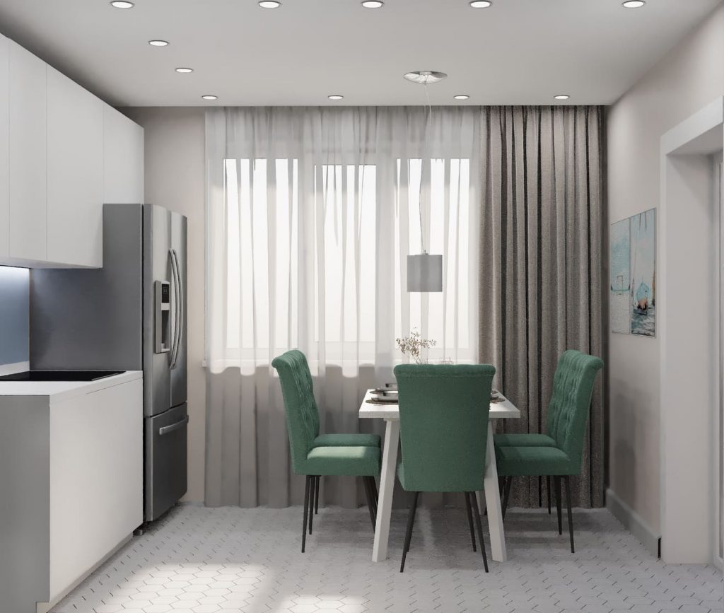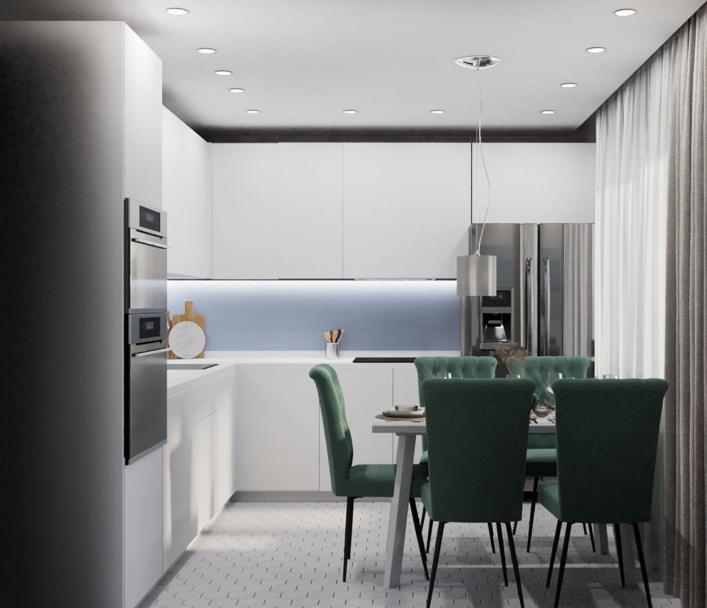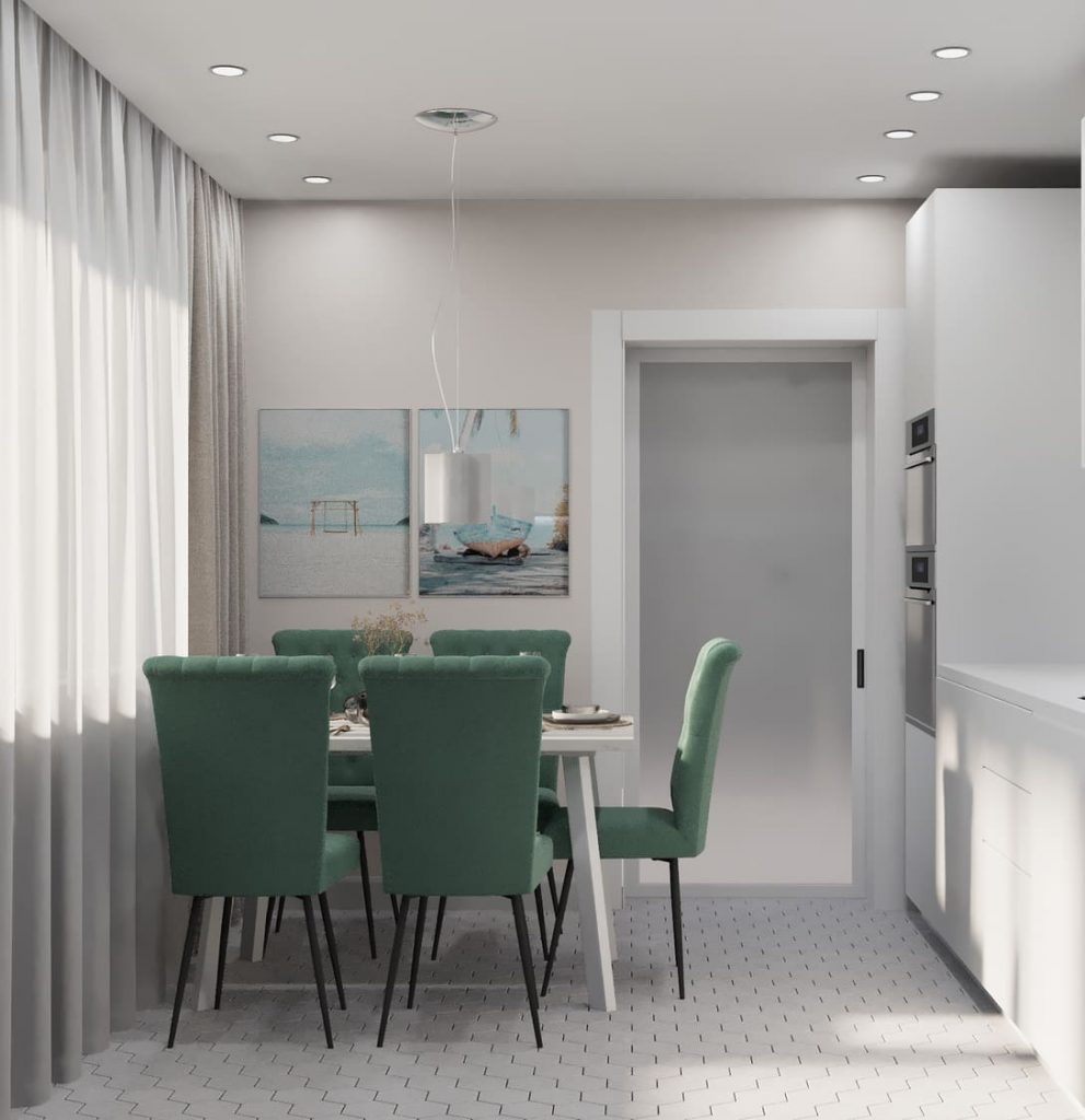 Акцентом стала зона столовой — обеденный стол и мягкие изумрудные стулья добавляют уюта и немного глубины в минималистичный интерьер. Мягкий рассеянный свет и светлая портьера создают тёплую атмосферу для семейных ужинов.