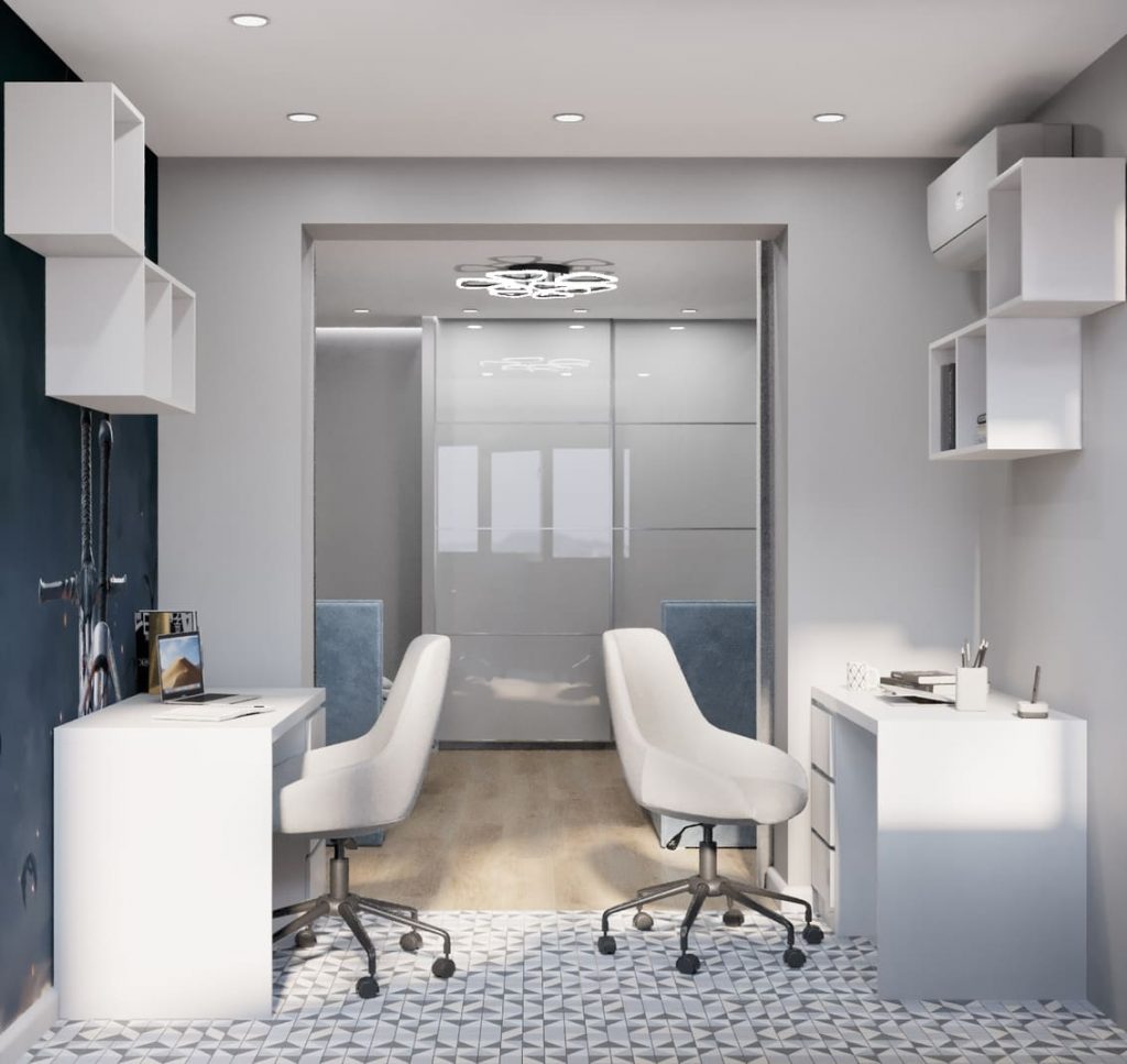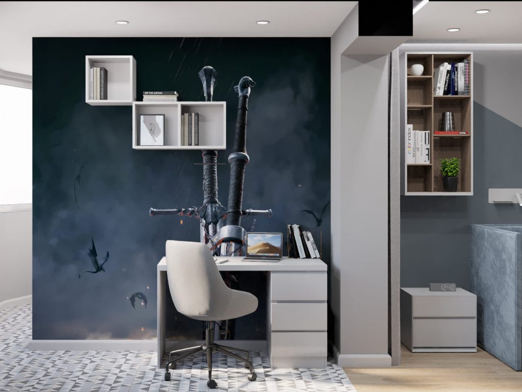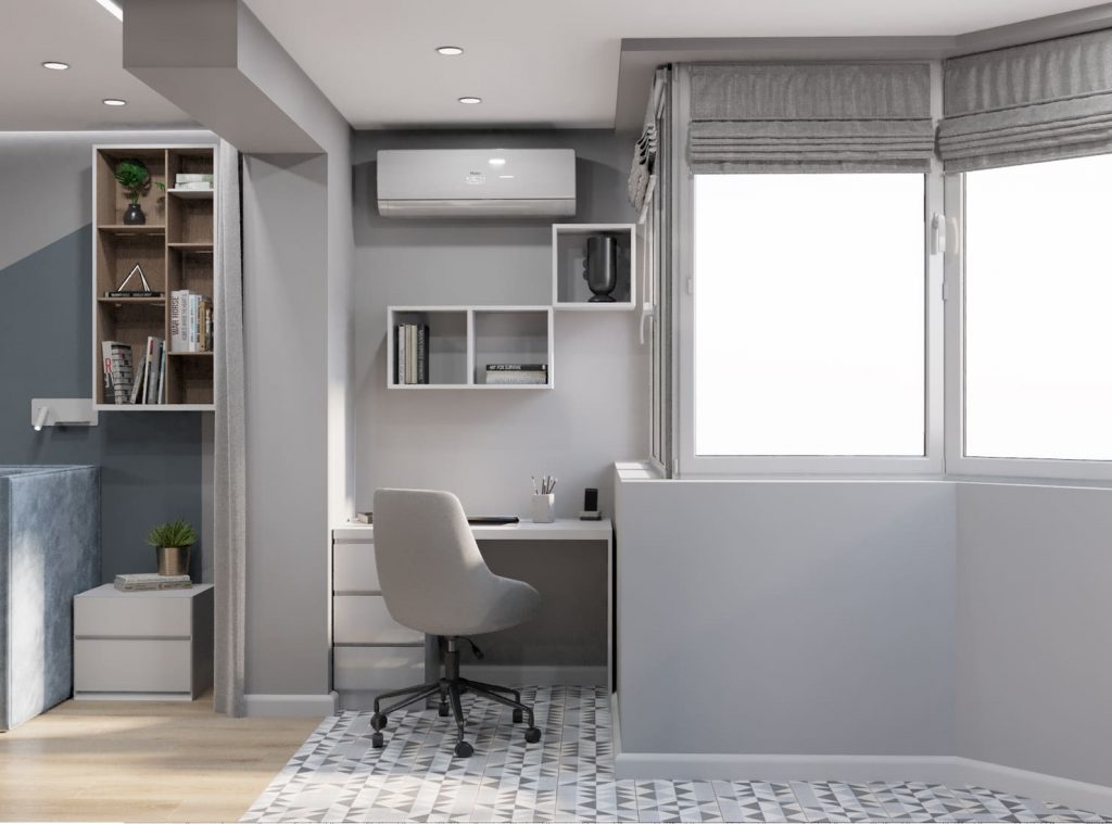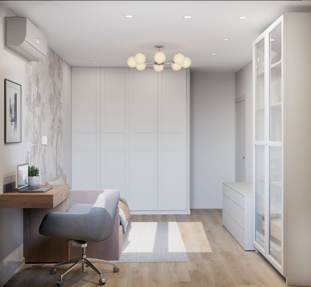 Рабочая зона устроена у окна: компактный письменный стол, удобное кресло и минимальный декор создают спокойную атмосферу для фокусировки. Благодаря синему текстилю и естественному освещению это место получилось визуально лёгким, но собранным.