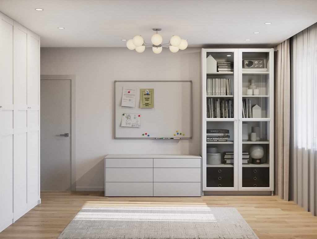 Система хранения продумана под рост и привычки ребёнка: вместительные белые шкафы с классическими фасадами и стеклянный стеллаж для книг и любимых предметов. А на свободной стене — магнитная доска, которую можно использовать как для расписания и заметок, так и для рисунков.
