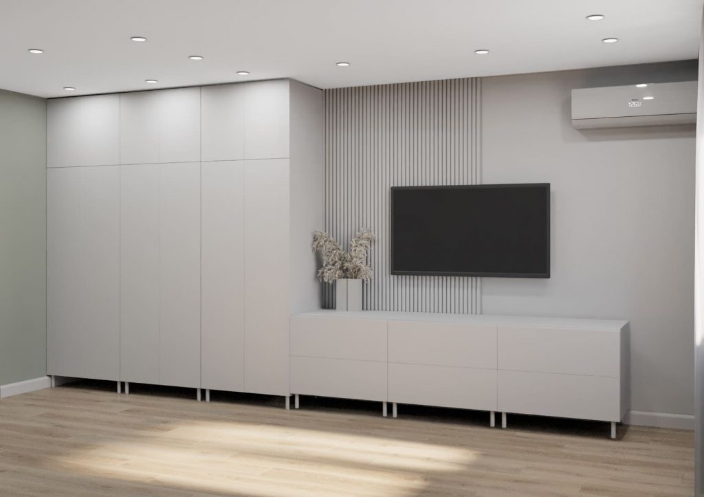 Система хранения встроена вдоль одной стены, а напротив кровати — ТВ-зона с декоративными вертикальными рейками. Такое решение добавляет текстуры и ритма, не перегружая пространство. Встроенное освещение создаёт равномерный световой фон и подчёркивает геометрию помещения.