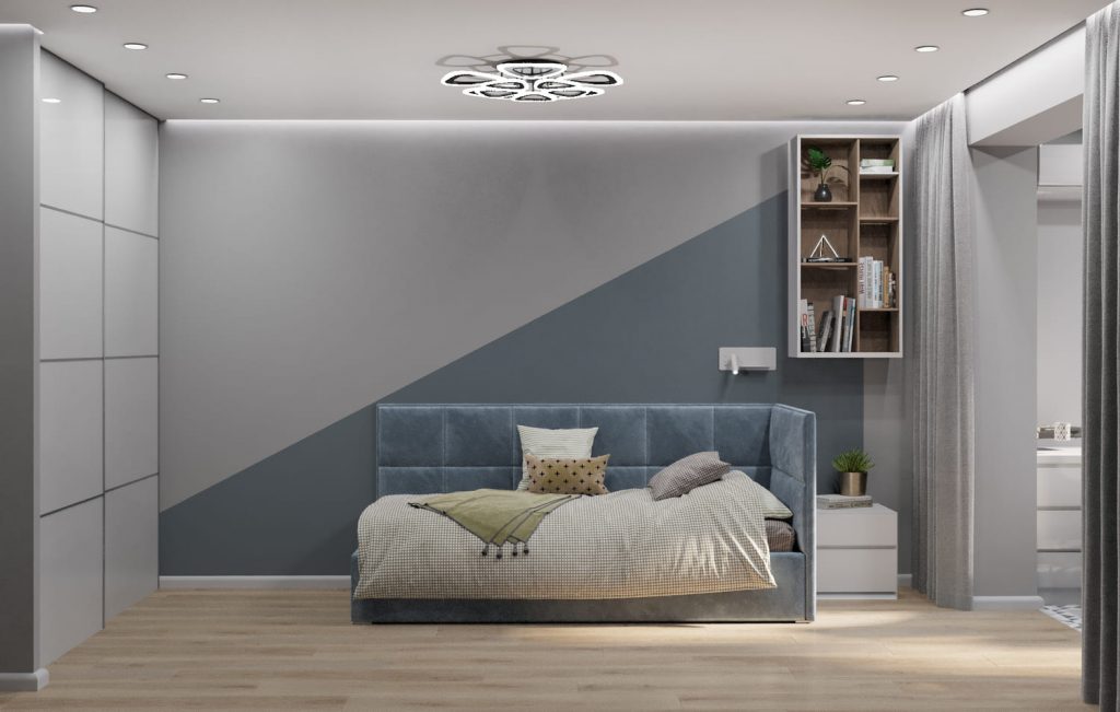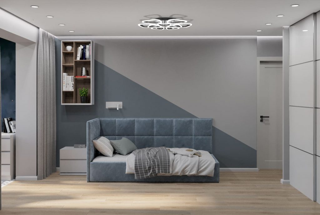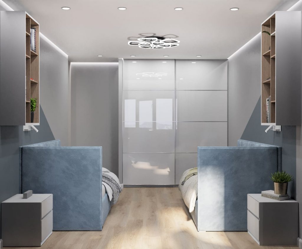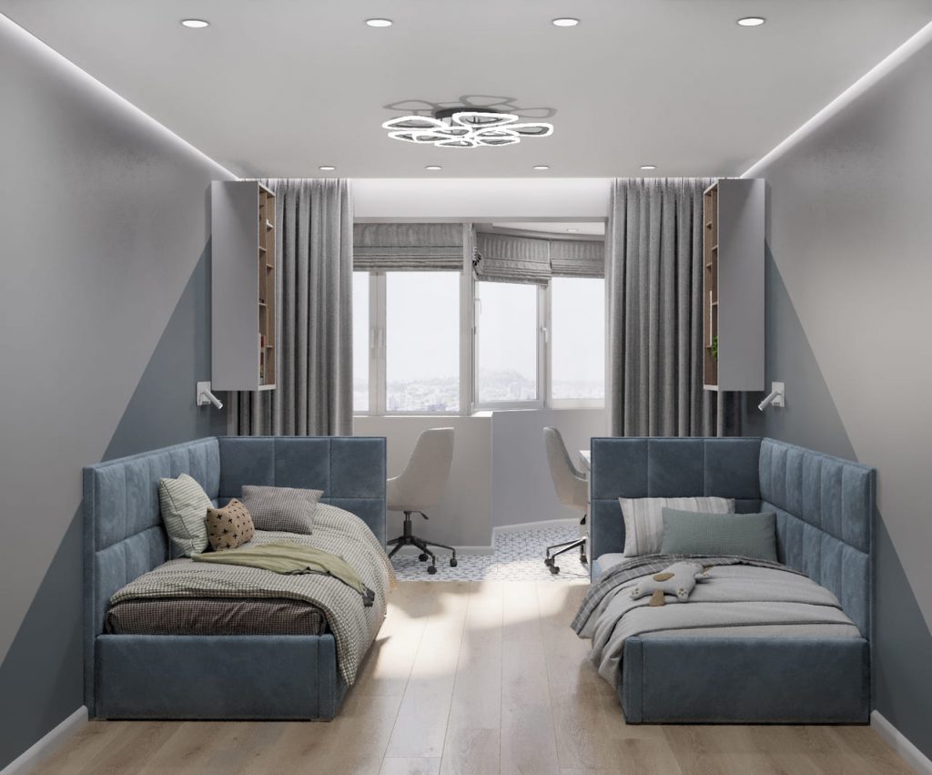 Каждая кровать оформлена в виде уютной ниши с высокими мягкими спинками, которые создают ощущение защищённости и визуально отделяют личную территорию. Стены выкрашены в спокойные серо-голубые оттенки с графичным диагональным акцентом — это придаёт интерьеру динамику, но не перегружает его.