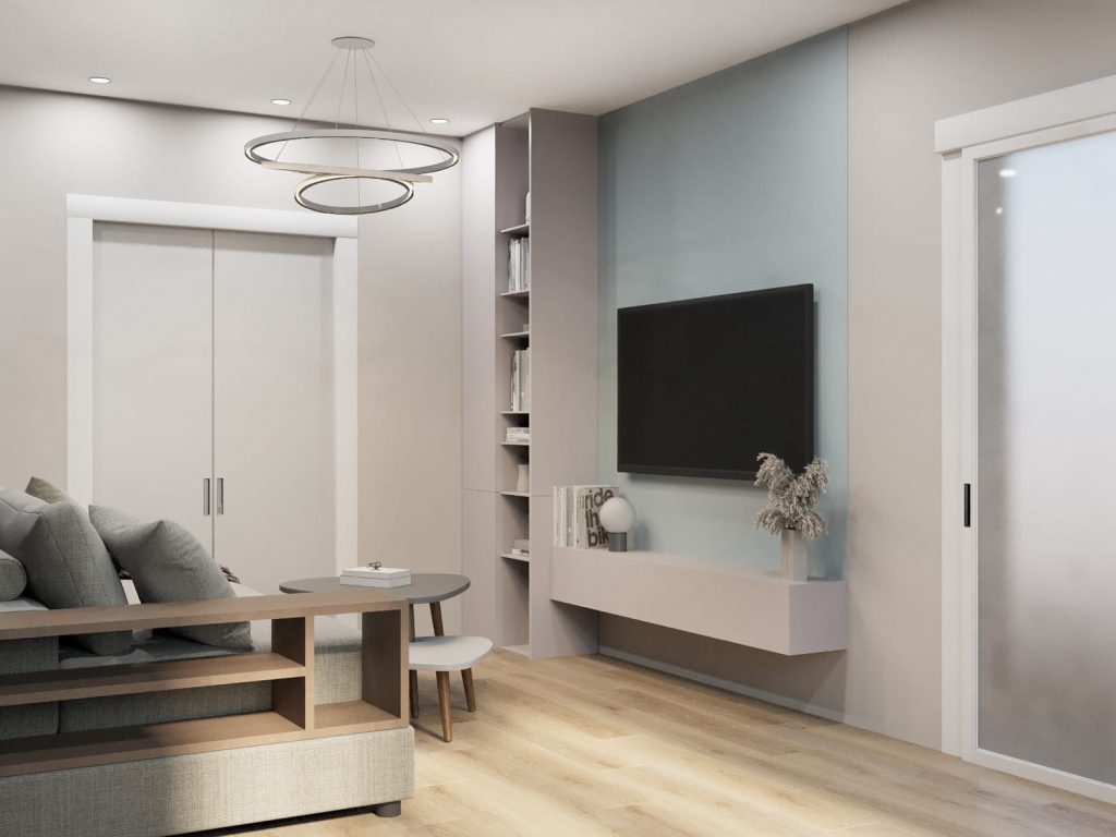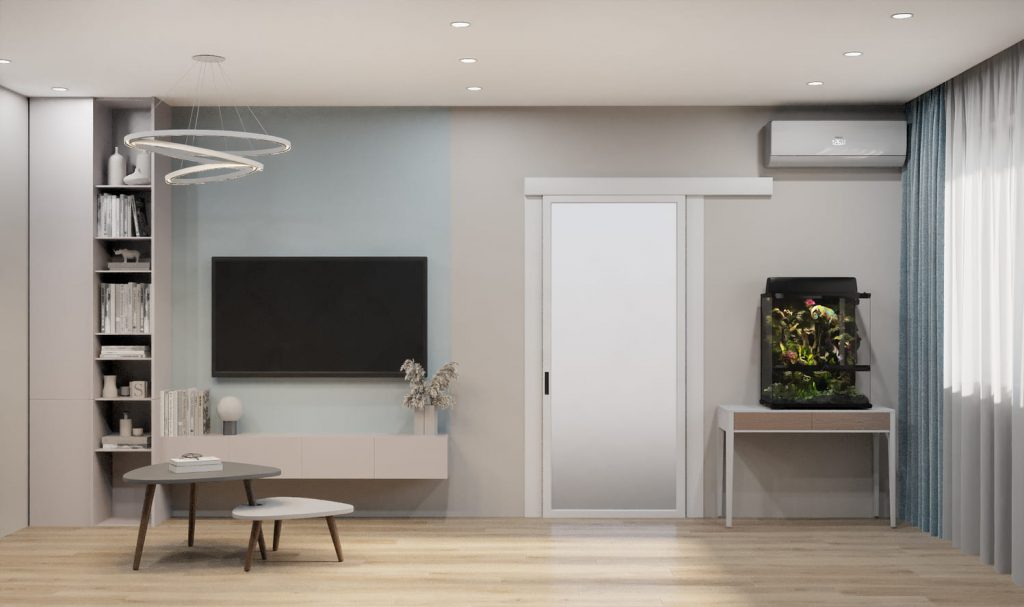 Медиа-зона оформлена лаконично: ТВ-панель, встроенная система хранения и аквариум, который добавляет живую, расслабляющую динамику в интерьер.