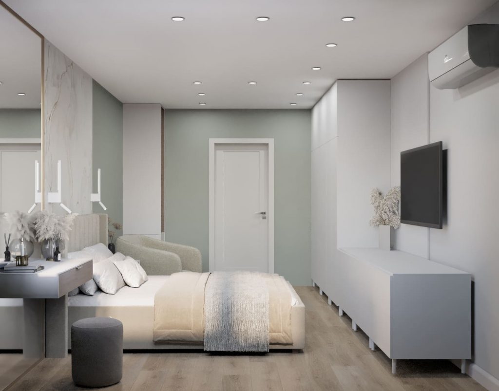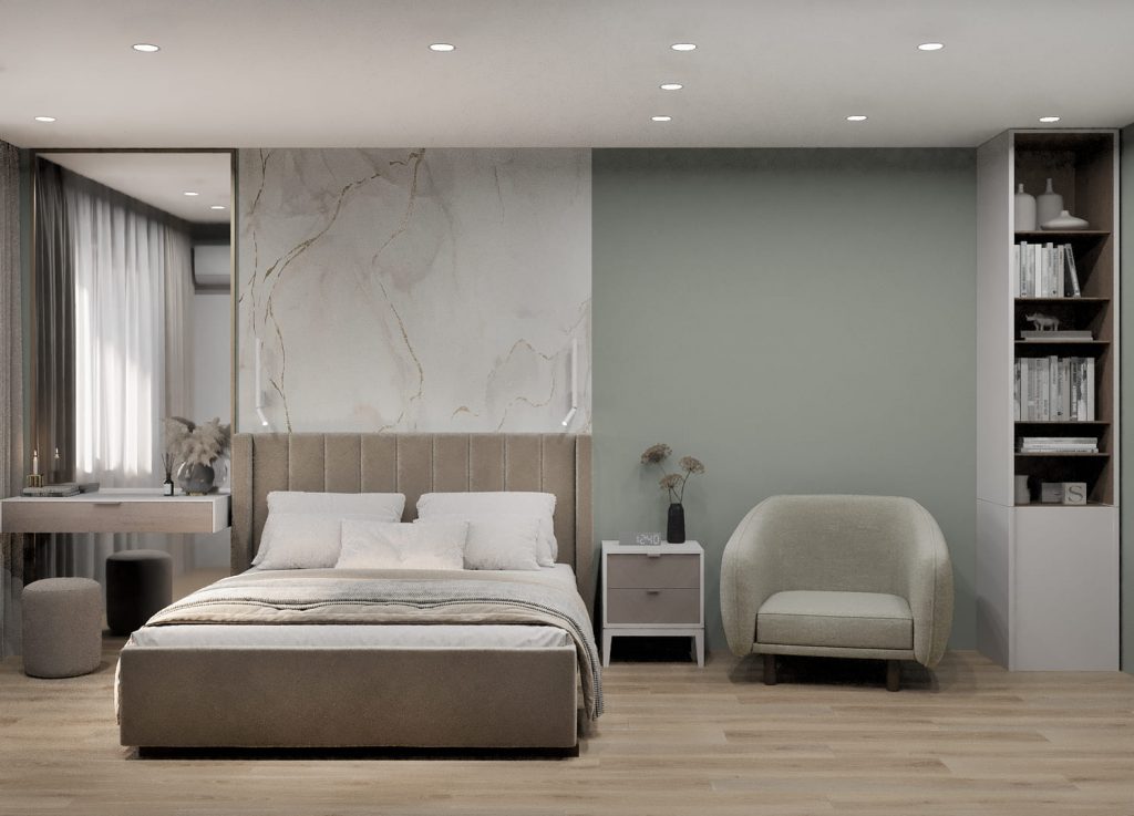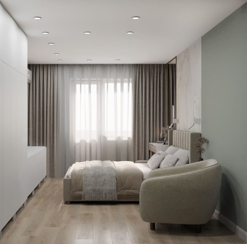 Мягкая зелёно-серая палитра стен работает как фон для мебельных элементов: лаконичного туалетного столика у окна, глубокого кресла и встроенных шкафов. Всё выполнено в спокойных, пудровых тонах, без визуального шума — для полного расслабления после дня.