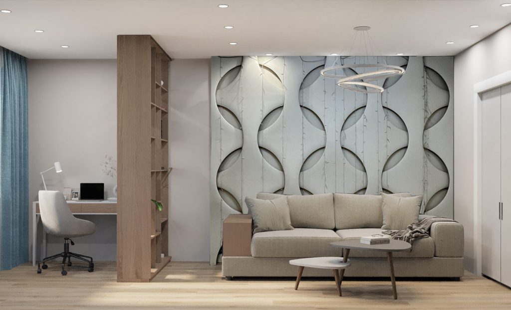 Сама зона отдыха организована вокруг мягкого дивана с большим количеством подушек и журнального столика с двумя уровнями. На стене — декоративные 3D-панели с плавным геометрическим рельефом, создающим мягкую игру теней. Светильник над диваном перекликается с узором стены и делает композицию завершённой.