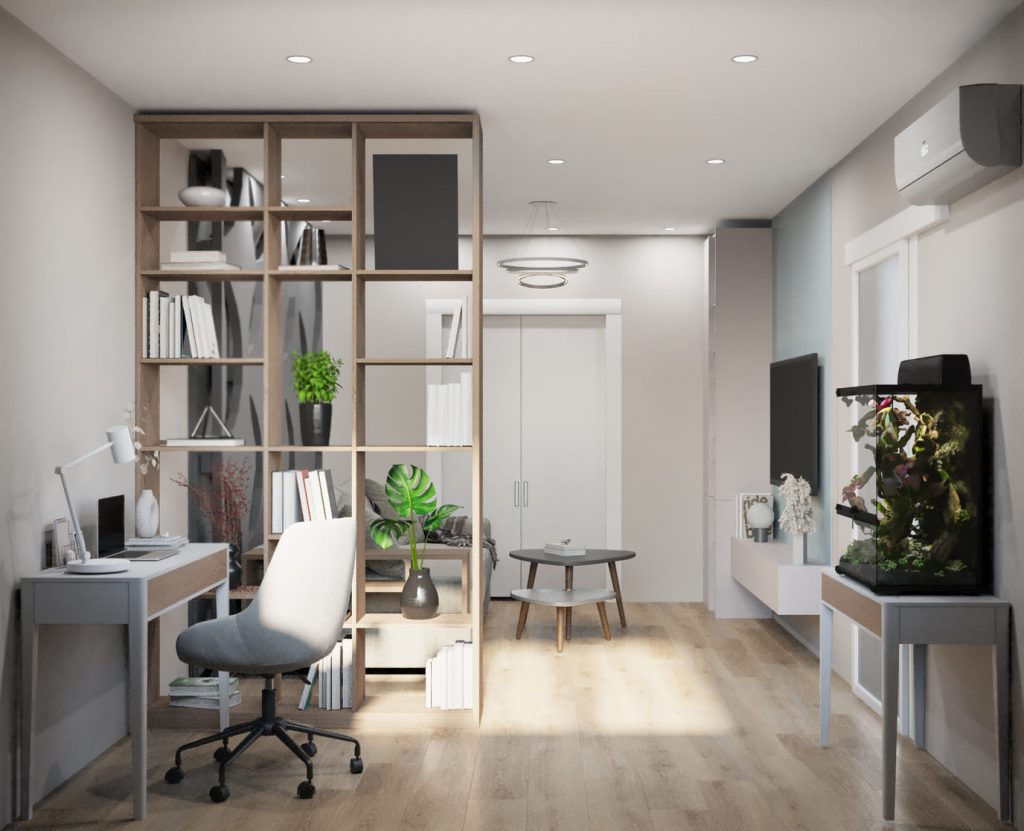 Пространство делится на две независимые, но визуально связанные зоны: уютную мягкую часть для отдыха и функциональное рабочее место у окна. Разделителем выступает открытый стеллаж — он не перегружает интерьер, пропускает свет и выступает как архитектурный акцент.