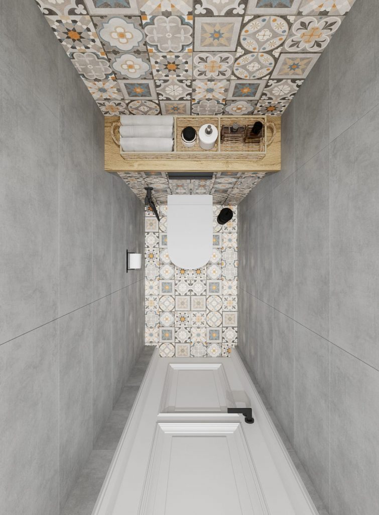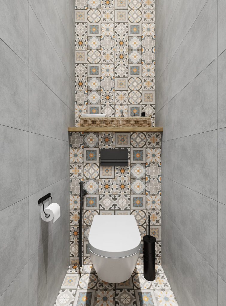 Основу составляют крупноформатные серые плитки под бетон — практичные и визуально расширяющие пространство. Главный акцент — плитка с орнаментом, которой оформлена задняя стена, пол и участок потолка. Это добавляет глубины и делает интерьер запоминающимся. Подвесной унитаз облегчает уборку, а над инсталляцией разместили деревянную полку — полезная деталь для хранения мелочей. Чёрная сантехника и держатель для бумаги добавляют графичности.