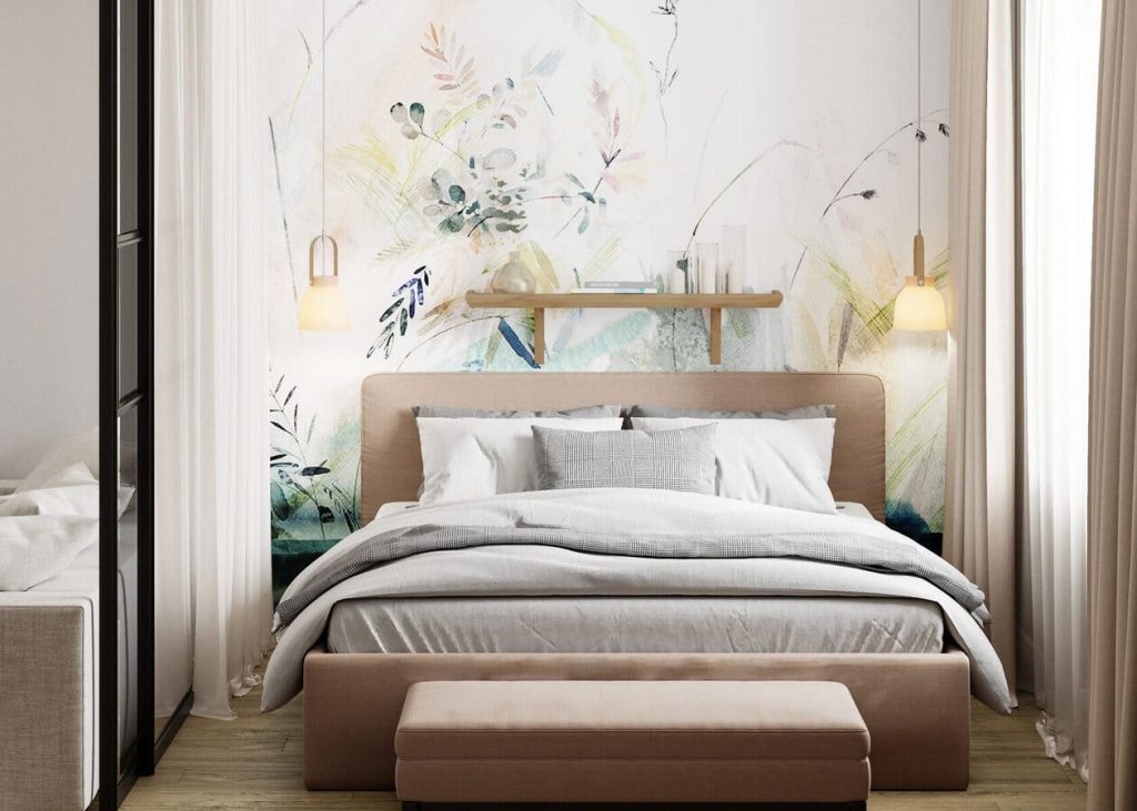 Спальня оформлена с мягкой палитрой и акцентной стеной с ботаническим принтом. Бежевое изголовье, светлое постельное бельё и симметричные подвесы создают спокойную и сбалансированную атмосферу. У окна разместили комод и зелёное растение — добавили уюта и воздуха.
