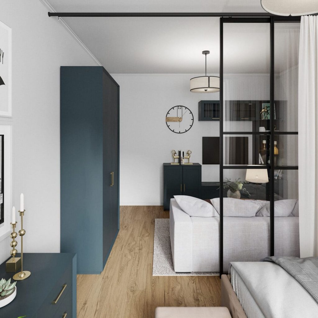 Перед нами стояла задача зонировать одну большую комнату на спальню и полноценную гостиную, не перегружая пространство и сохранив уют. Решение — лёгкая стеклянная перегородка с текстильной шторой. Она даёт чёткое разделение зон, при этом не «съедает» свет.