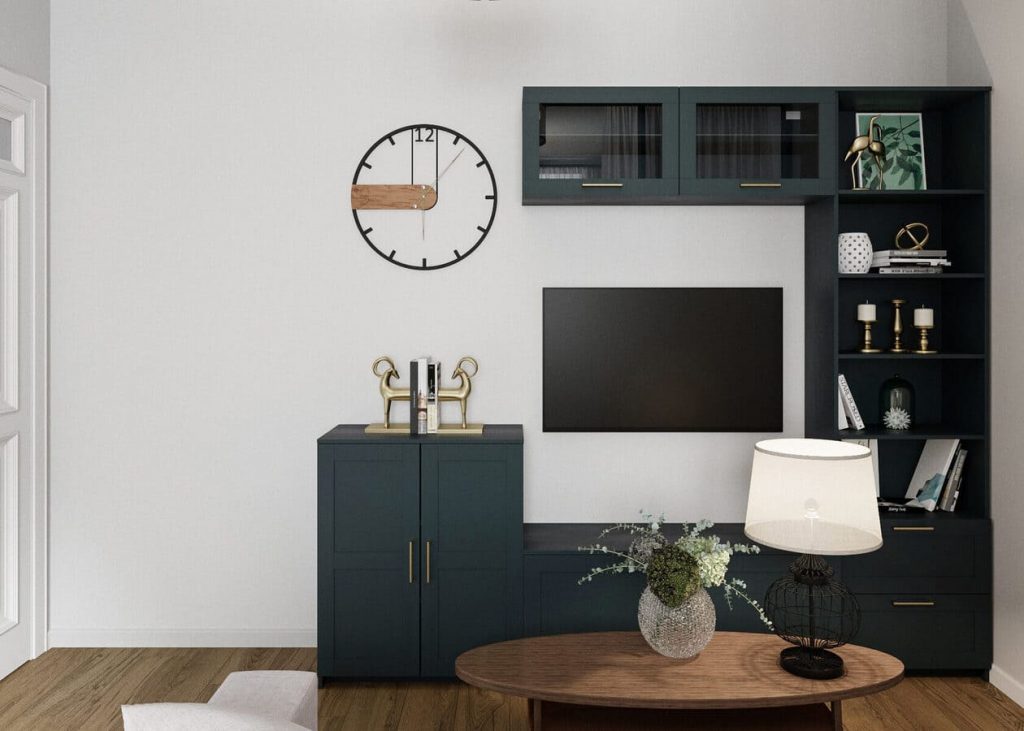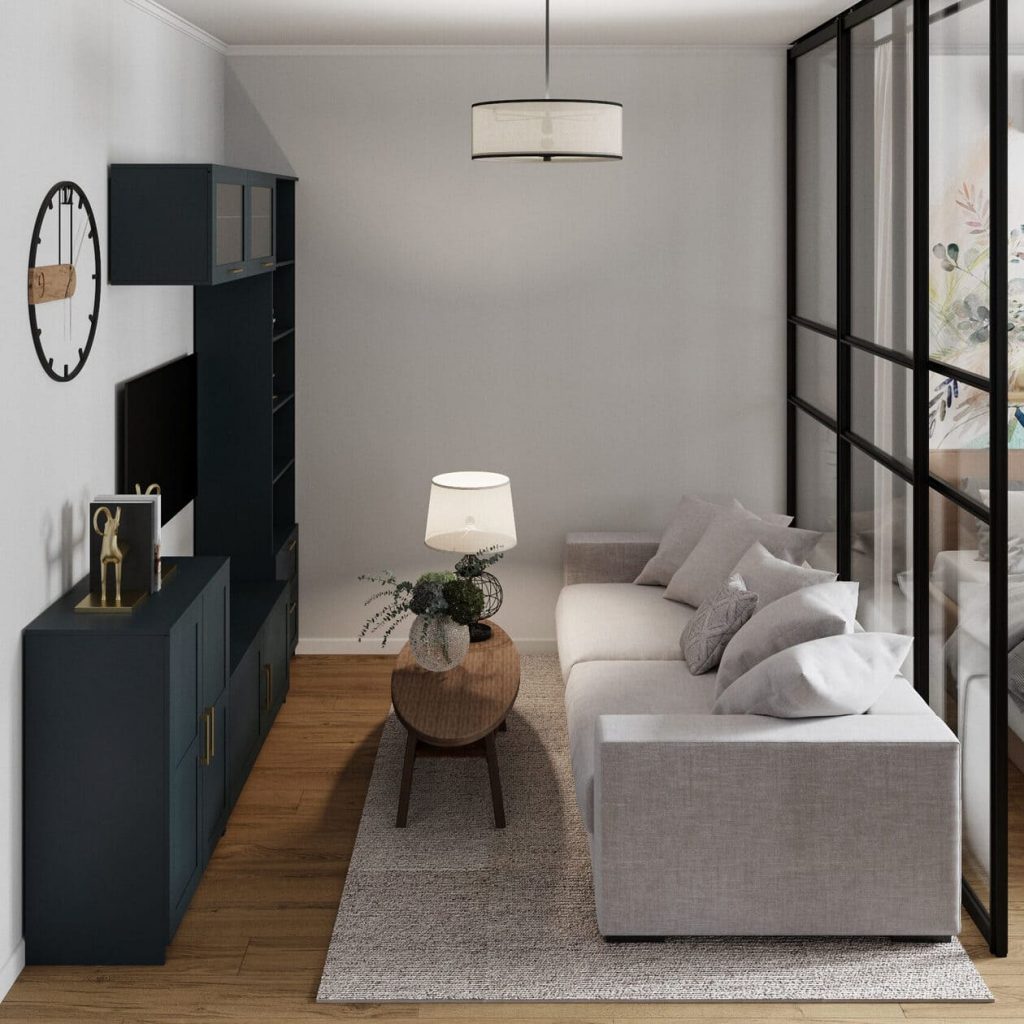 В зоне гостиной — компактный диван, мягкий ковер и графичная мебель глубокого синего оттенка. Все продумано для хранения и комфорта: ТВ-зона с открытыми и закрытыми секциями, комод, журнальный столик.