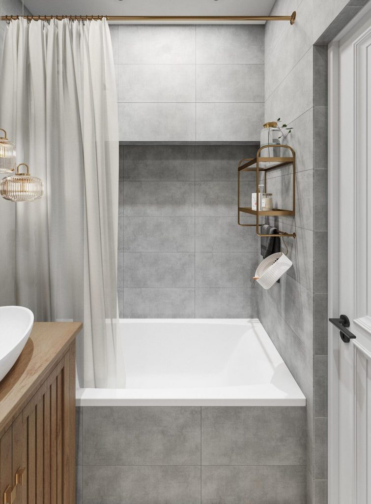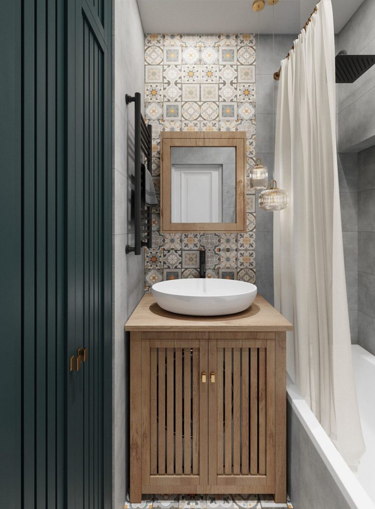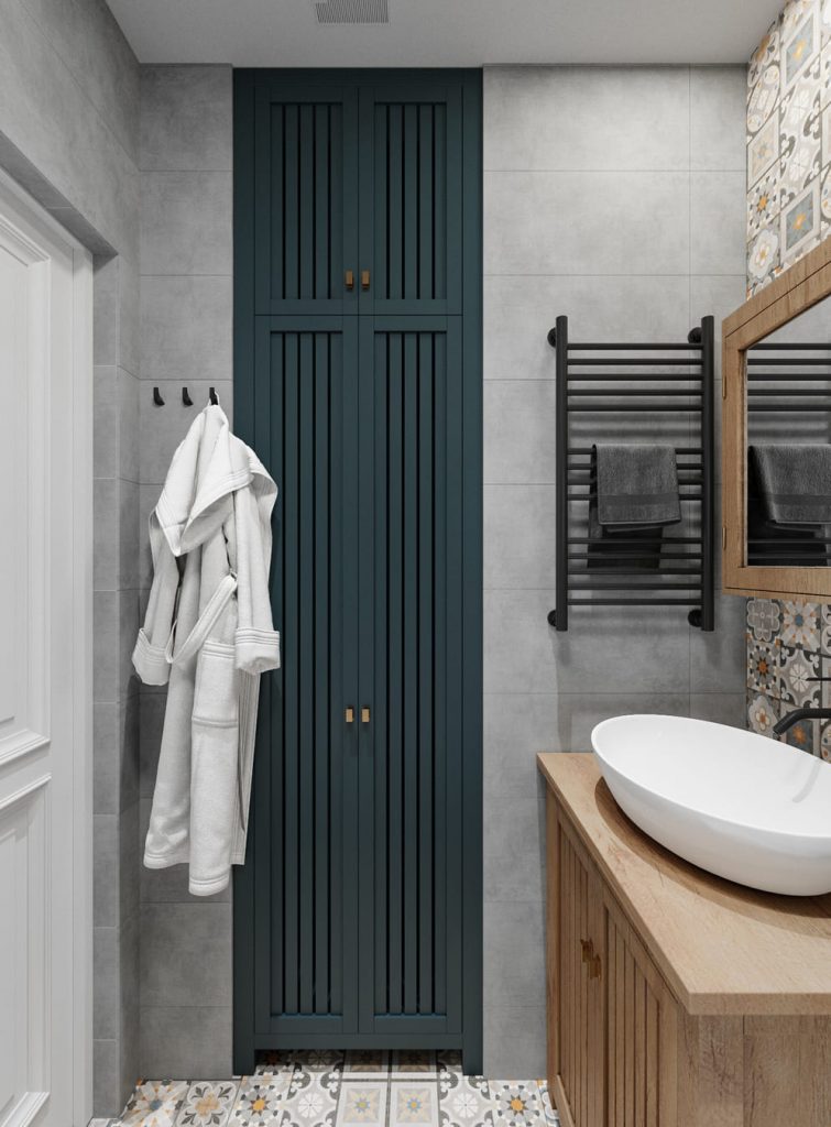 Основу интерьера составляют практичные серые плитки под бетон, которые визуально расширяют пространство и легко сочетаются с цветными акцентами. Для теплоты и уюта добавили элементы под дерево — тумбу с раковиной и зеркало в раме. Особое внимание — встроенному пеналу в оттенке глубокого синего: он добавляет цвета, вмещает всё необходимое и визуально вытягивает помещение вверх. Мелкая плитка с орнаментом на полу и стене у зеркала стала ярким акцентом и оживила интерьер. Мягкое освещение, подвесные светильники и аккуратный чёрный полотенцесушитель завершают образ.