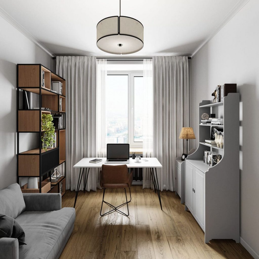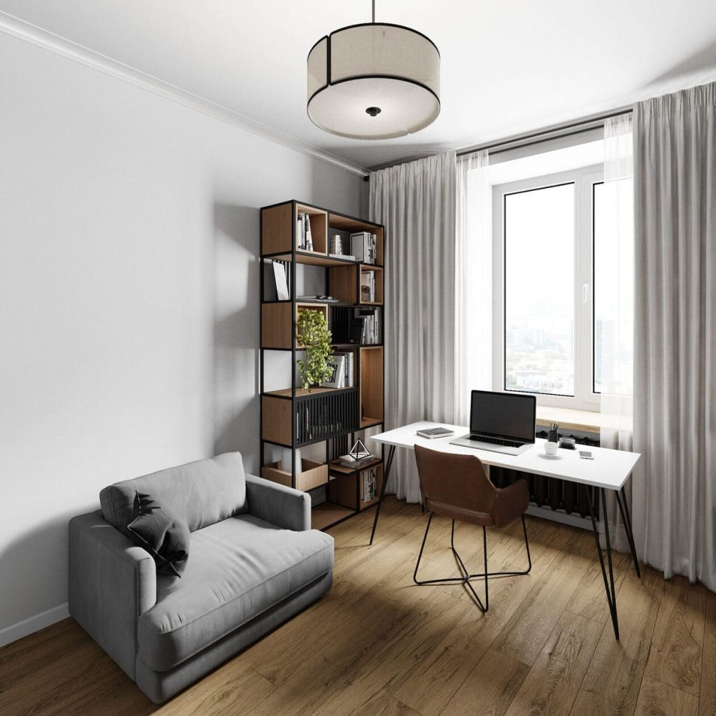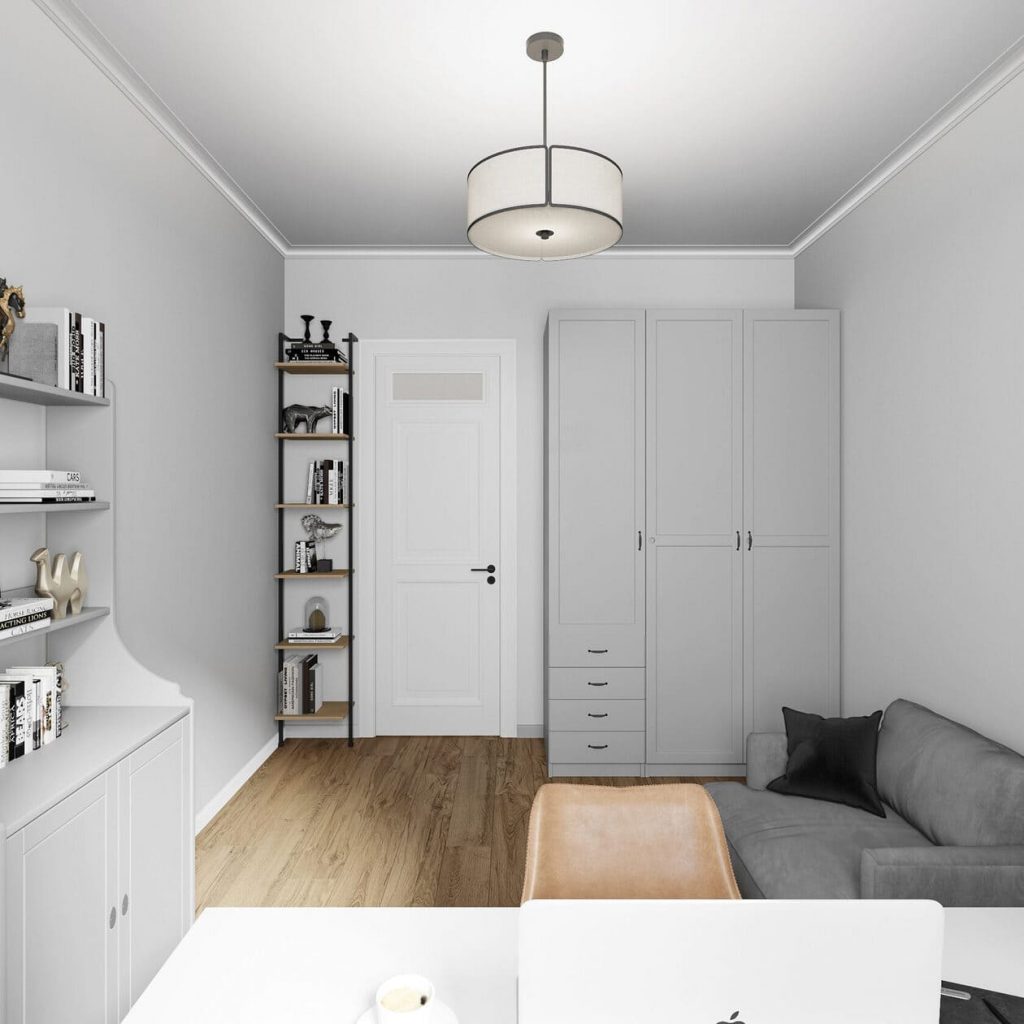 Эта комната раньше планировалась как будущая детская, но пока в ней обустроили полноценный кабинет — светлый, строгий и удобный. У окна — рабочее место с лаконичным столом и эргономичным креслом. С двух сторон его обрамляют открытые стеллажи с книгами и декором. Место хранению уделили особое внимание: в комнате два вместительных шкафа — один закрытый, второй комбинированный. Мягкое кресло у стены добавляет уюта и даёт возможность сменить позу в течение дня. Светлые стены, серо-белая палитра и нейтральные шторы создают спокойный фон, не отвлекающий от задач.
